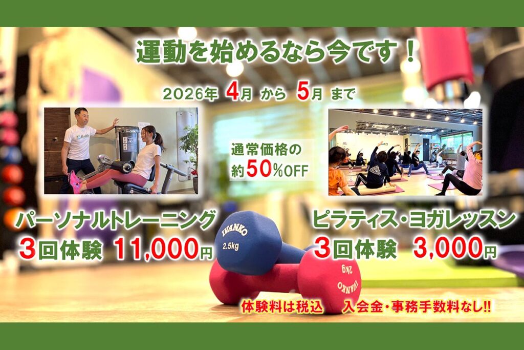 明舞の「Buddy Training Studio」で3回体験キャンペーン開催中!パーソナルトレーニングやピラティス・ヨガが5月末まで約50%OFF