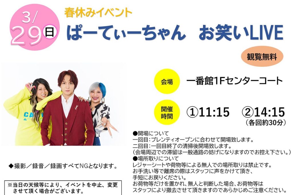 西神中央のプレンティで観覧無料の「春休みイベント ぱーてぃーちゃん お笑いLIVE」が3月29日開催!