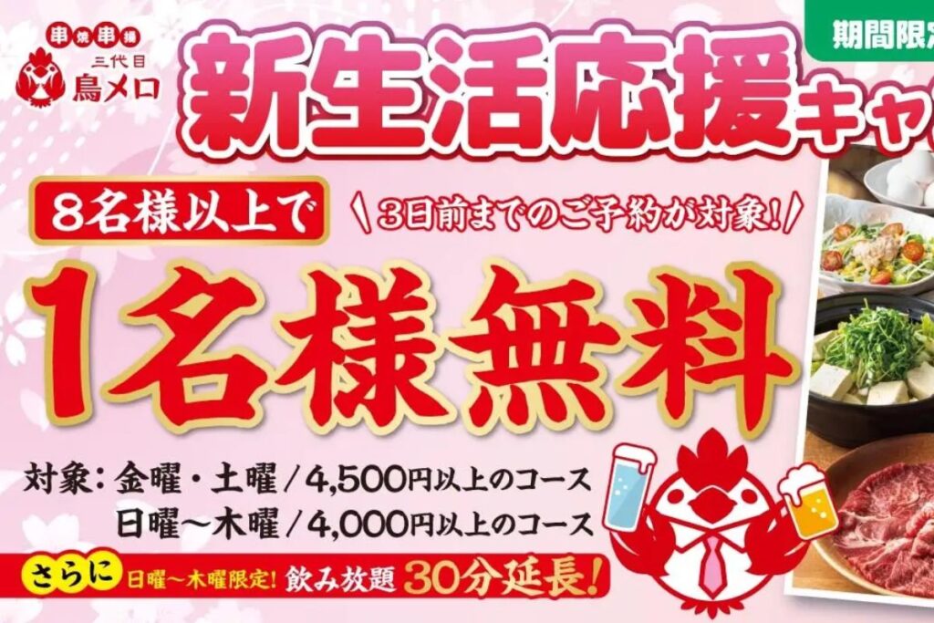 居酒屋の三代目鳥メロで8名以上の利用で1名分無料になる「新生活応援キャンペーン」が4月1日~27日の期間開催!明石駅前店も対象