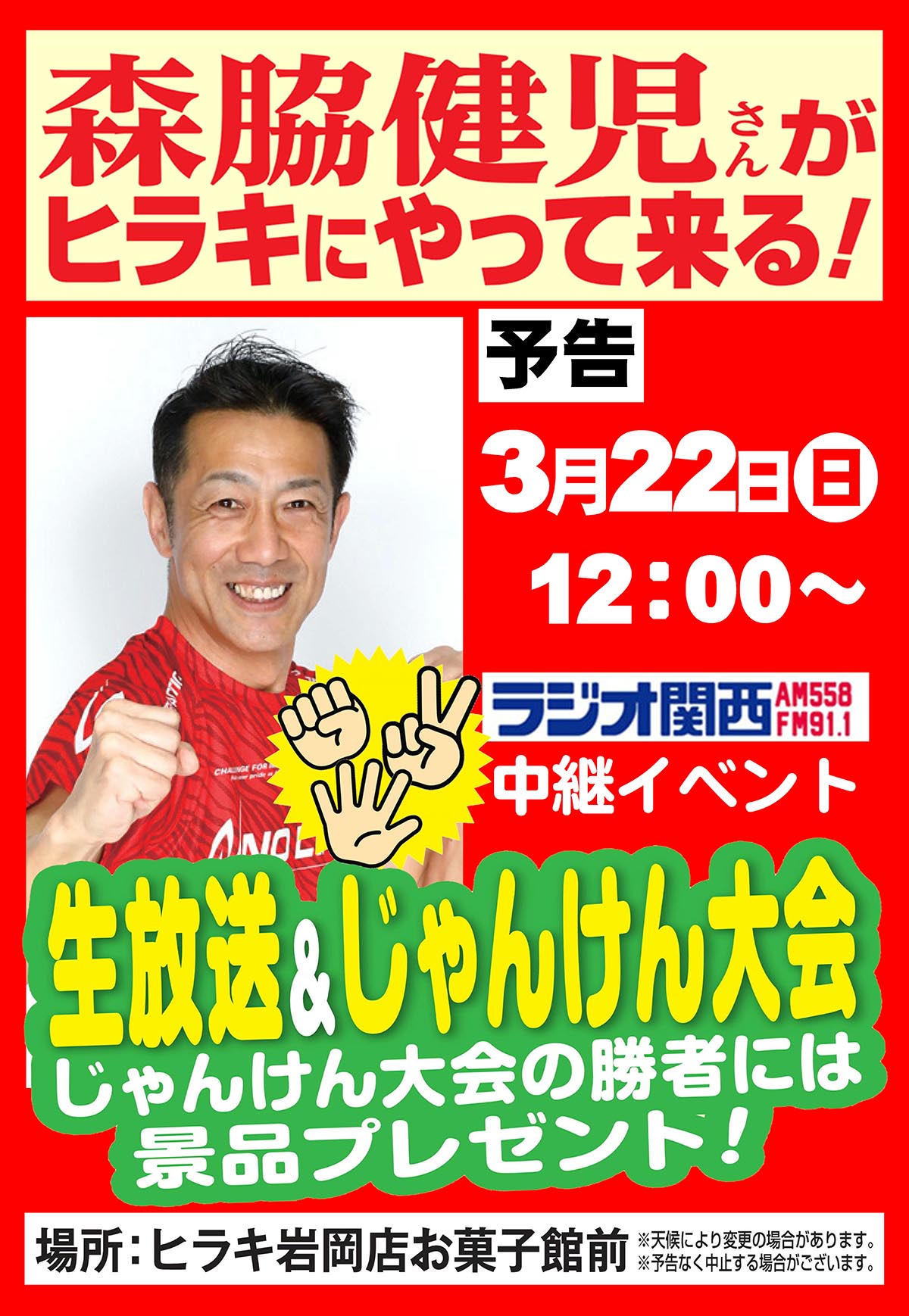 神戸市西区岩岡町野中にある「ヒラキ岩岡店」のお菓子館前で、ラジオ関西の中継イベント「森脇健児さんがヒラキにやって来る!」が2026年3月22日(日)に開催されます!