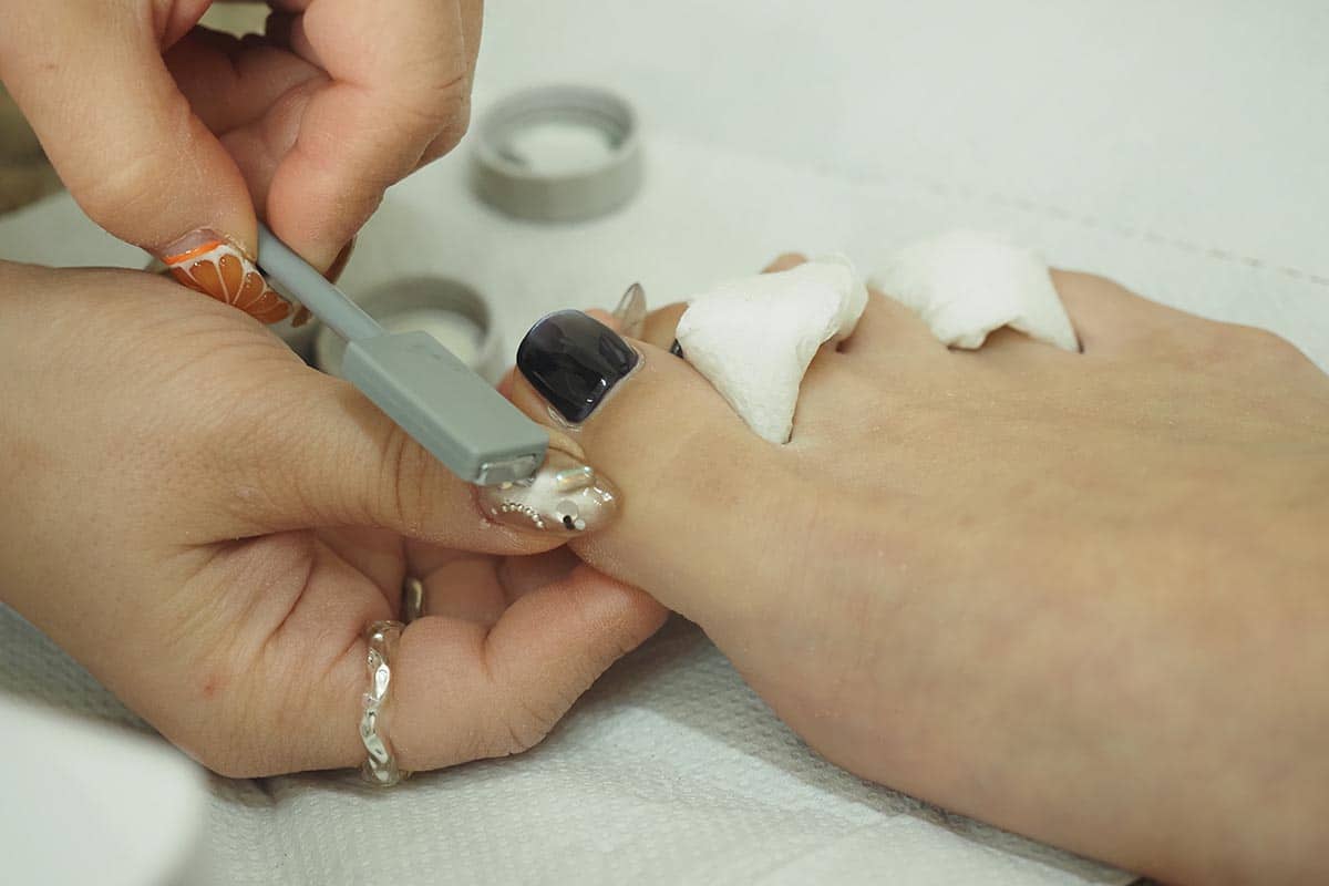 ジェルネイルを塗る前のお手入れも手際よく終わり、いつの間にかジェルがonされています・・・