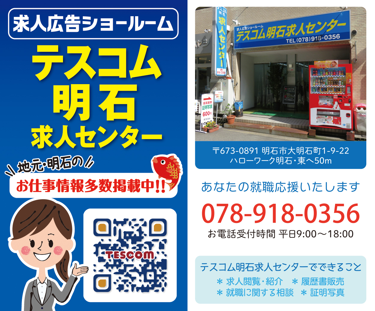 ハローワーク明石から東に50mほどの場所にある求人広告ショールーム「テスコム明石求人センター」に今秋の新着求人情報を聞いてきました!