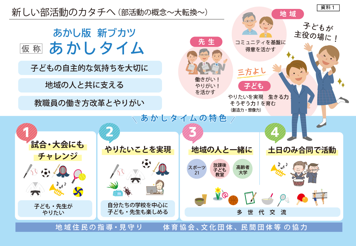 公立中学校の部活動地域展開(地域移行)について、明石市では休日の中学校部活動が2027年(令和9年)8月末で終了となり、同年2027年(令和9年)9月から休日のみ地域展開(地域クラブ活動)となる予定です!