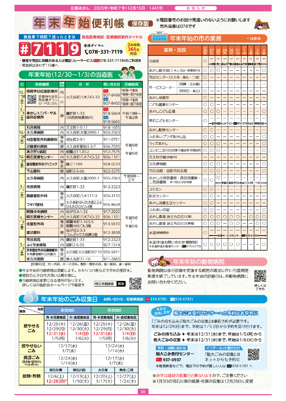 広報あかし No.1443(2025年12月15日)の8ページに年末年始便利帳(保存版)として年末年始の当直医、年末年始の市の業務、年末年始のごみ収集日などの情報がまとめられています!
