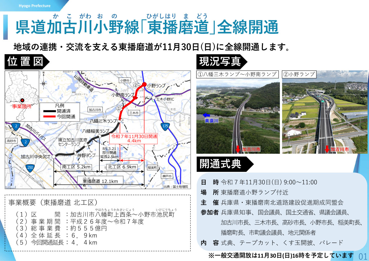兵庫県が整備を進めてきた自動車専用道路東播磨南北道路(東播磨道)が2025年11月30日(日)16:00に全線開通を迎えます!