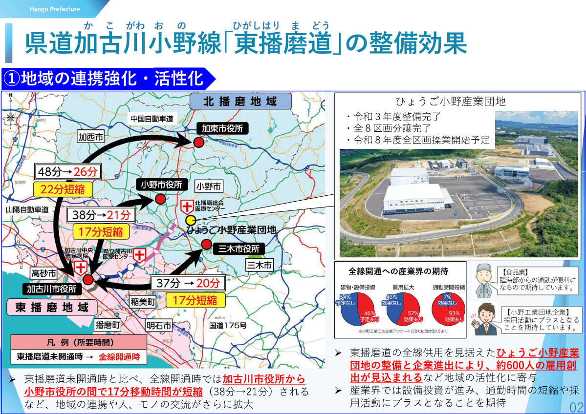 沿線で3次救急を担う県立加古川医療センターや2次救急の北播磨総合医療センター、加古川中央市民病院を結ぶ「命の道」とされ、全線開通で搬送時間の短縮や一般道の渋滞解消が期待される。