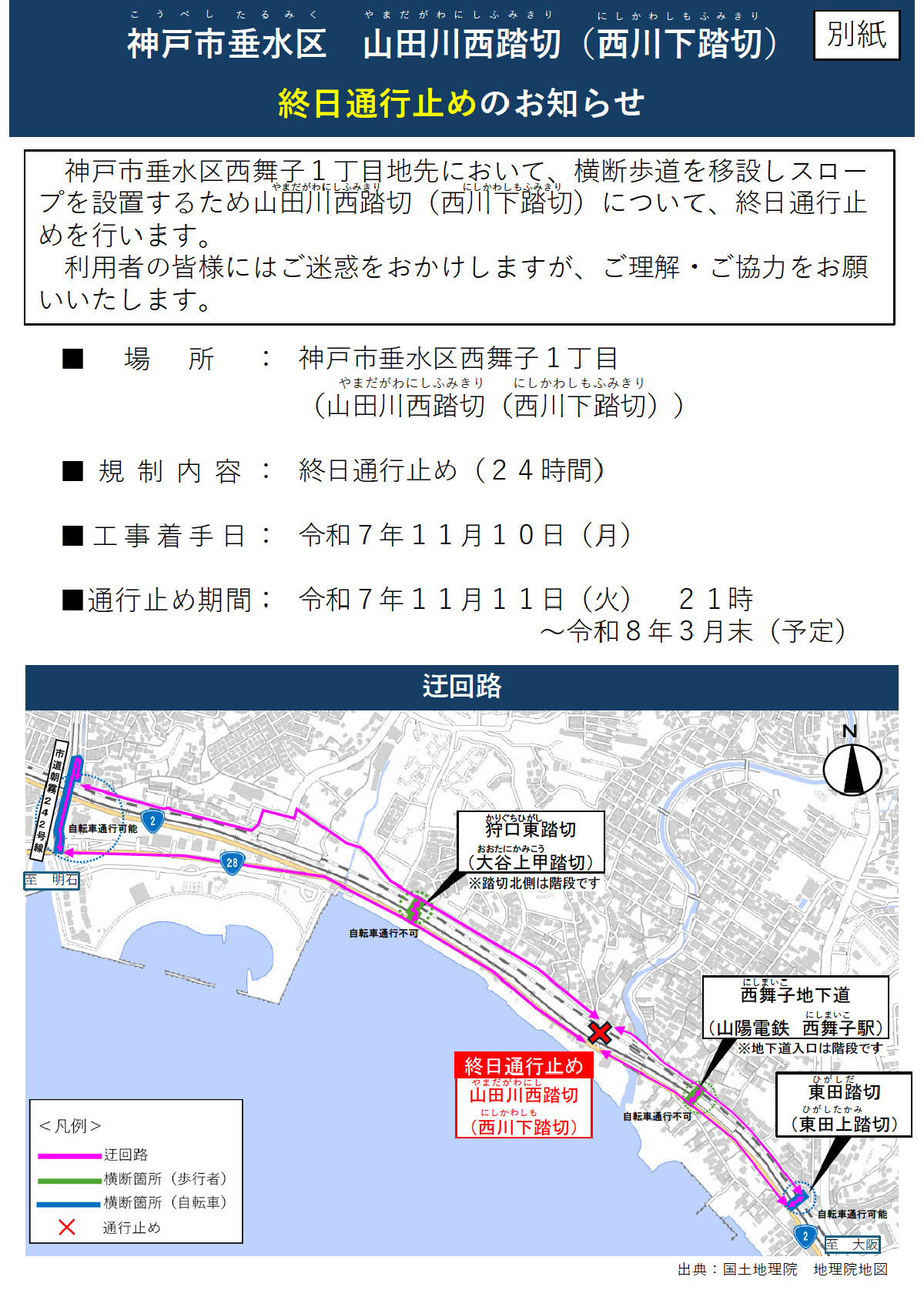 神戸市垂水区西舞子1丁目にある山陽電鉄西舞子-大蔵谷間の「山田川西踏切(西川下踏切)」が工事のため2026年3月末まで終日通行止めになっています!