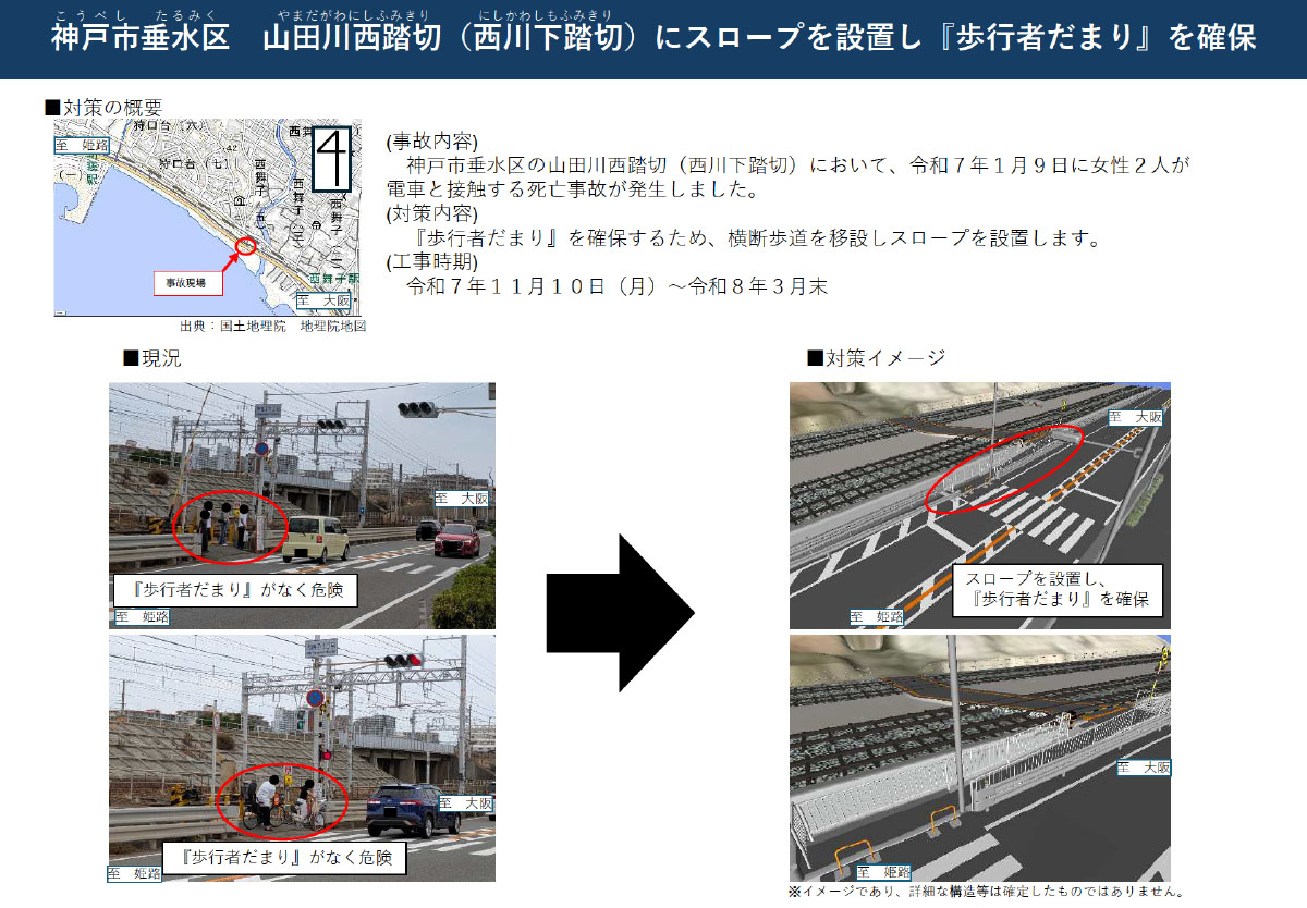 山田川西踏切では、2025年1月に線路の南側に並行する国道2号の信号待ちをしていた中国人観光客の女性2人が、普通電車にはねられて死亡する事故が発生していました。元々、危険箇所として認識されてきたようですが、廃止には賛否があることから緊急的に国道の横断歩道をずらし待機スペースを広げることになったようですね