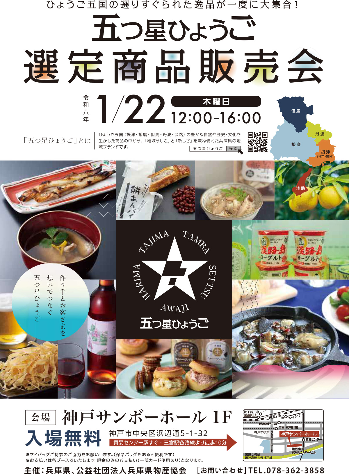 神戸市中央区にある「神戸サンボーホール」で、令和7年度(2025年度)の「五つ星ひょうご選定商品販売会」が2026年1月22日(木)に開催予定です!