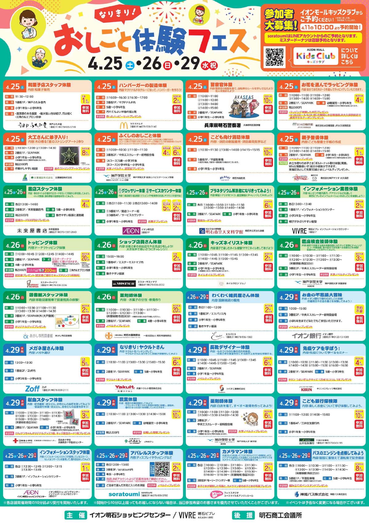 JR大久保駅前の商業施設「イオン明石ショッピングセンター」で「なりきり!おしごと体験フェス」が2026年4月25日(土)・26日(日)・29日(水・祝)の3日間開催されます!