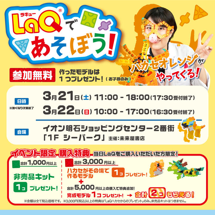 手のひらサイズの作品を作ることができ、作り方通りに作れた作品はプレゼントされるとのこと(お子様のみ)。イベント限定のLaQ購入特典もあり、LaQの面白さを伝えるべく関西を中心に日々活動しているハカセオレンジが来られるとのことです!