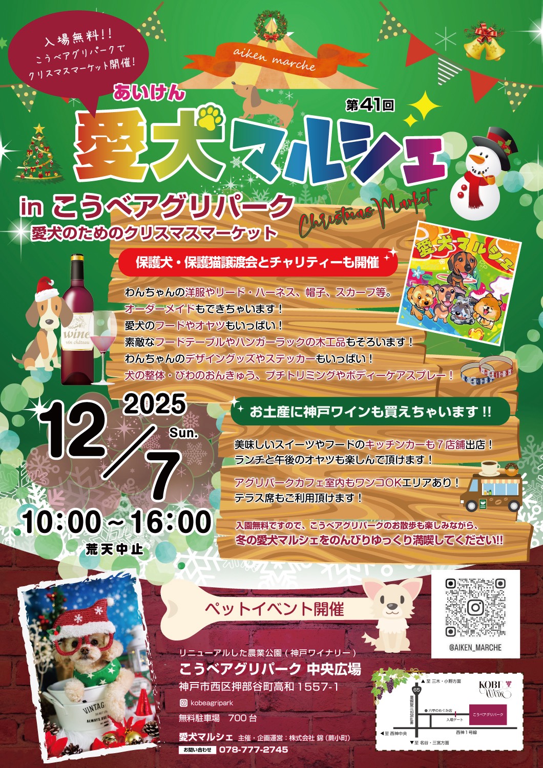 神戸市西区押部谷町高和にある農業公園「こうべアグリパーク(旧神戸ワイナリー)」で、第41回となるペットイベント「愛犬マルシェ in こうべアグリパーク」が2025年12月7日(日)に開催されます!