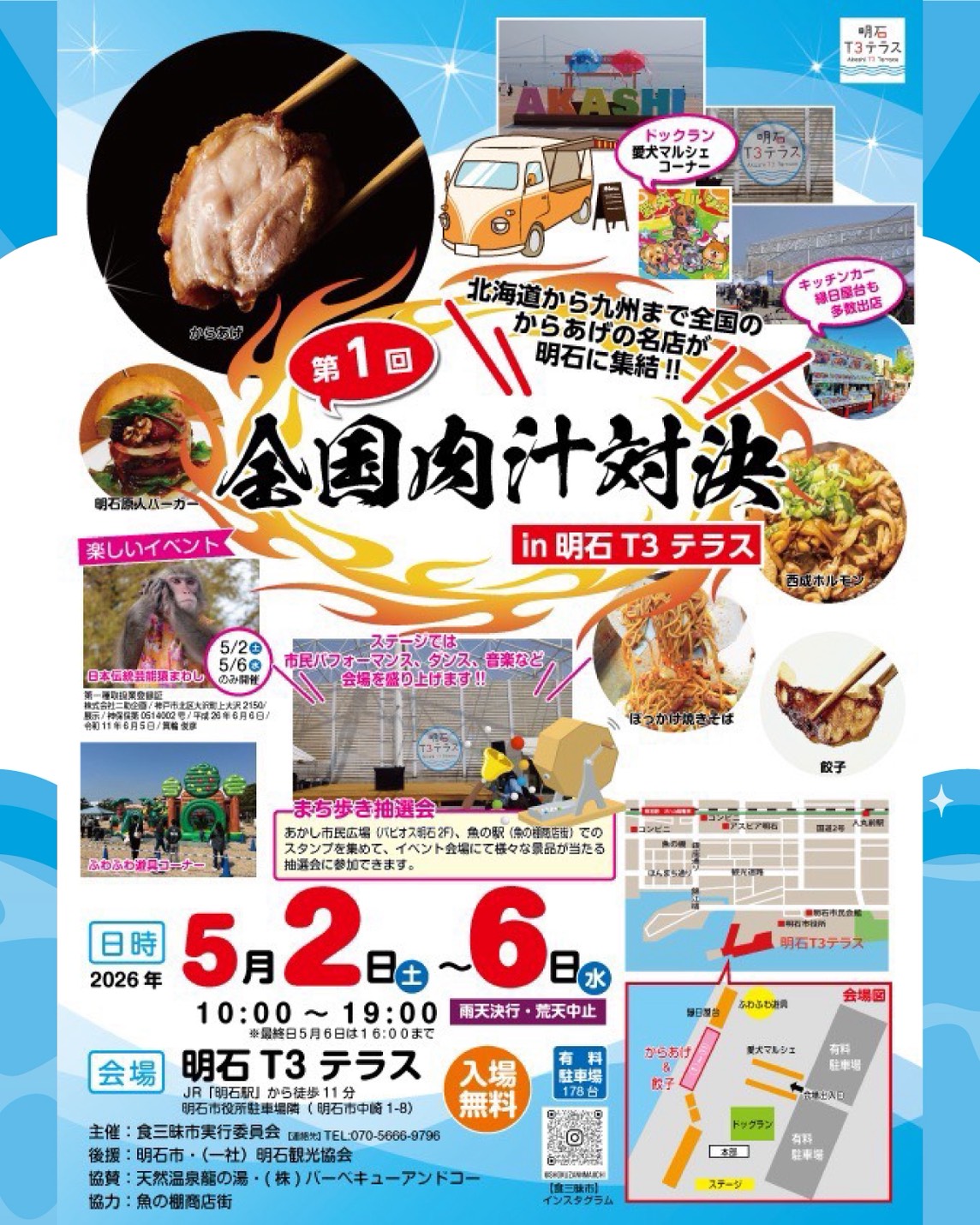 第1回 全国肉汁対決in明石T3テラス 明石市役所近くの明石港東外港地区にある新スポット「明石T3テラス」で、北海道から九州までの全国のからあげ・餃子の名店が明石に集...