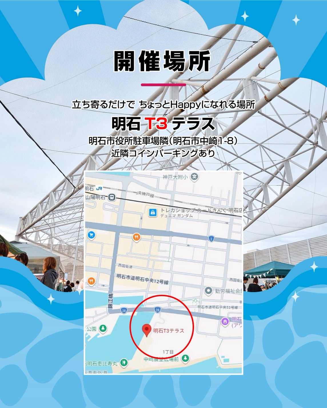 会場の隣には明石市役所駐車場(178台)がありますが、周辺コインパーキングなども満車になる可能性が高そうなのでご注意ください!