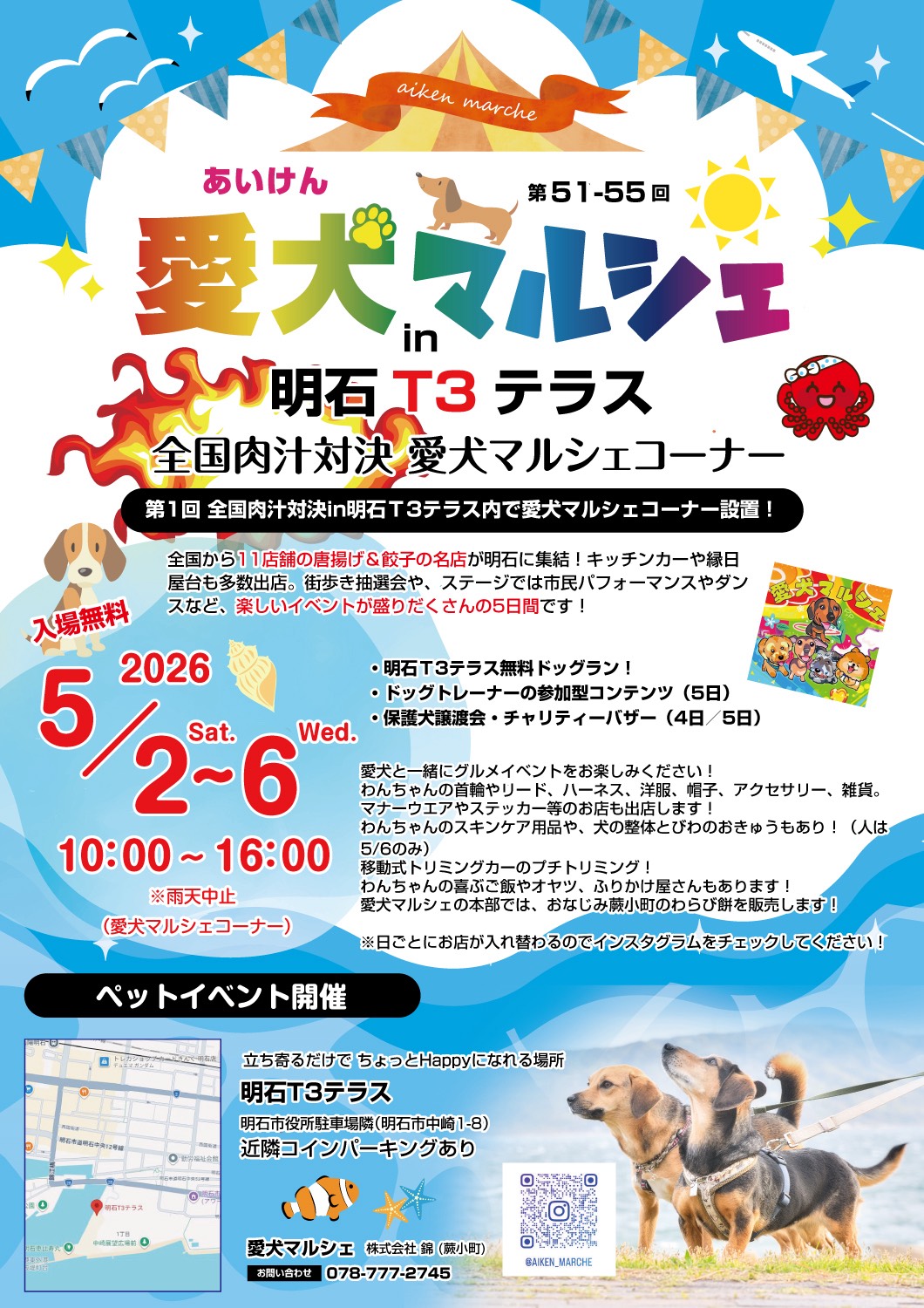 明石市役所近くの明石港東外港地区にある新スポット「明石T3テラス」で、ペットイベント「愛犬マルシェ in 明石T3テラス」が2026年5月2日(土)~6日(水・祝)の期間開催されます!