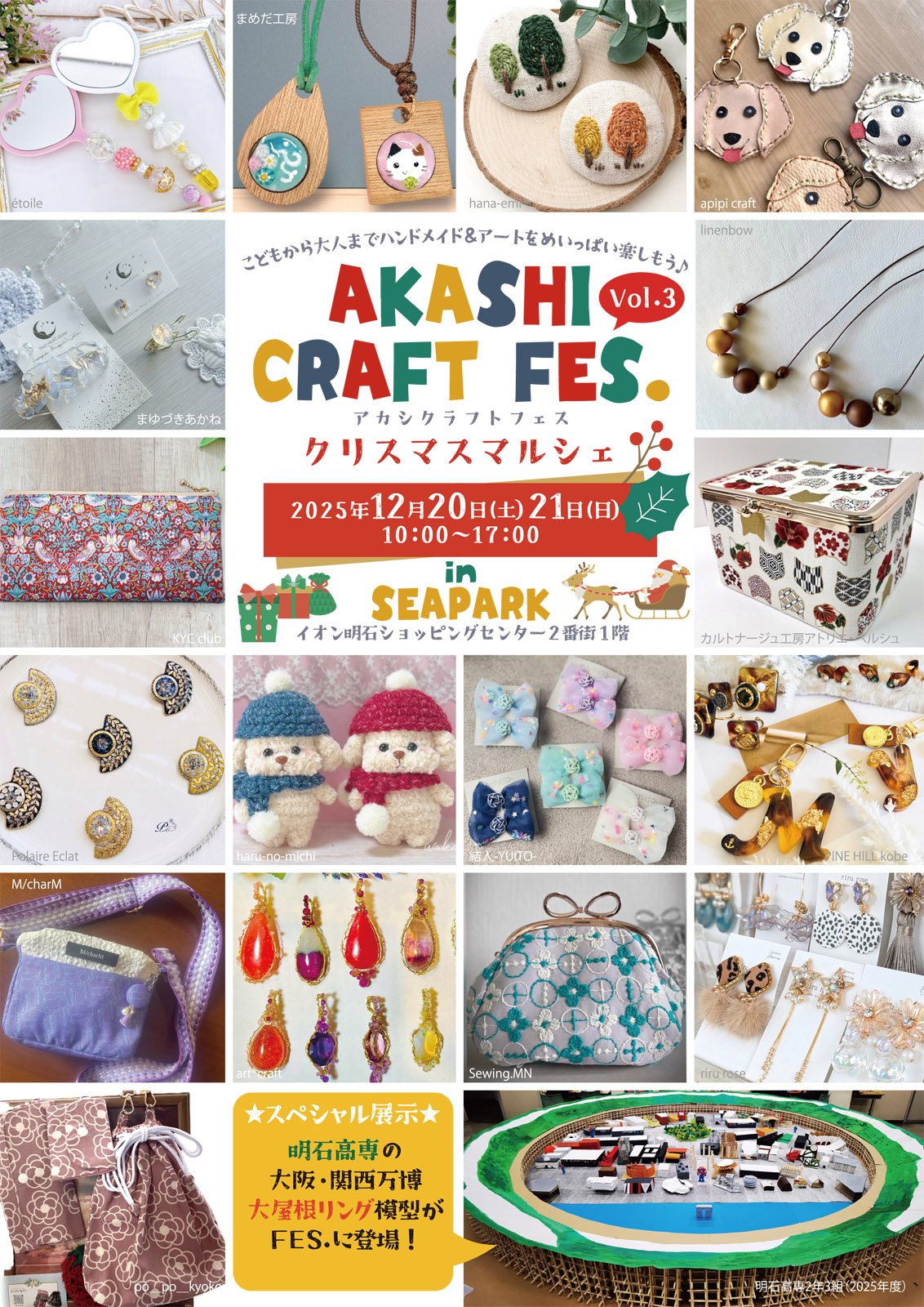 JR大久保駅前の商業施設「イオン明石ショッピングセンター」2番街1階のシーパークで「AKASHI CRAFT FES. Vol.3 クリスマスマルシェ」が2025年12月20日(土)・21日(日)に開催されます!