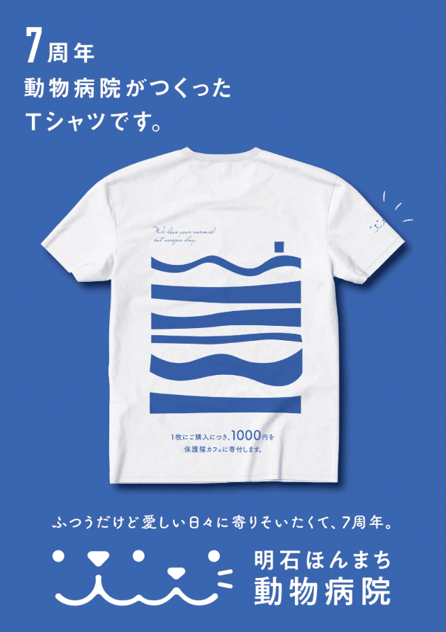 7周年記念オリジナルチャリティーTシャツを、カルテのある方に1家族1枚プレゼントされているほか、2枚目以降はチャリティーTシャツとして、税込2500円で販売されています。こちらのTシャツは1枚につき購入価格から500円と、追加で病院から500円の合計1,000円を保護猫カフェに寄付されるそう!