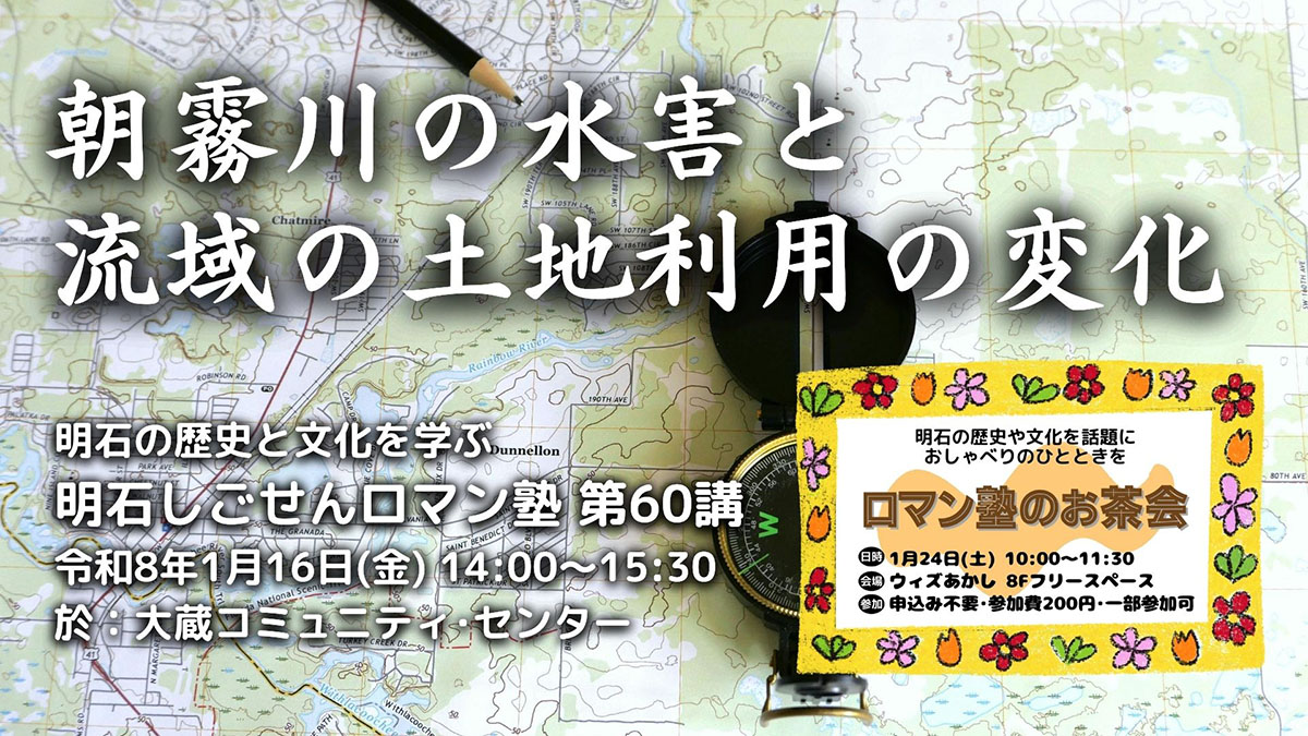 明石しごせんロマン塾は大蔵コミセン主催の市民講座を受講した市民が立ち上げた明石エリアの歴史と文化を主体的に学ぶための場です。今回は「朝霧川の水害と流域の土地利用の変化」をテーマに、神戸学院大学人文学部 教授の矢嶋 巌氏が登壇されます!