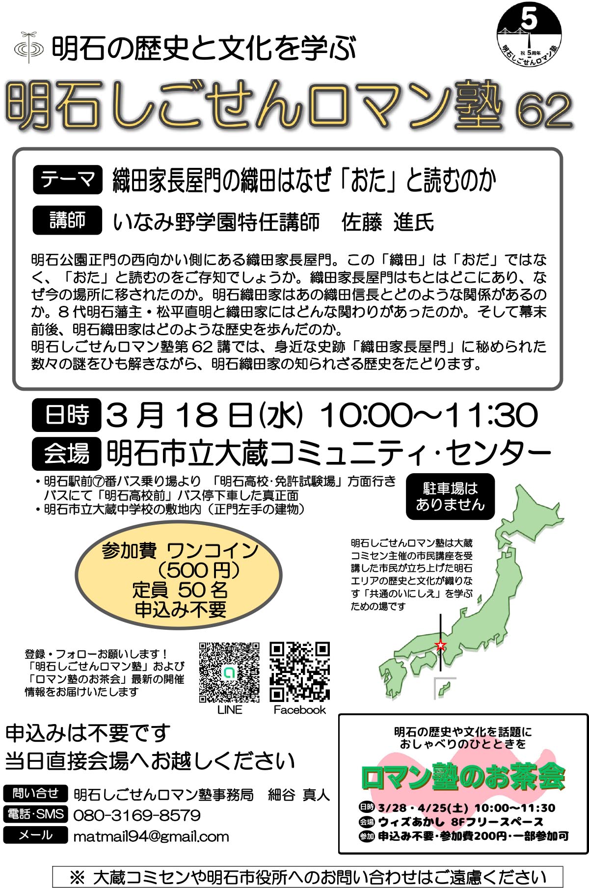 明石市立大蔵中学校内にある「大蔵コミュニティ・センター」で、明石の歴史と文化を学ぶ「明石しごせんロマン塾 第62講」が2026年3月18日(水)に開催されます!