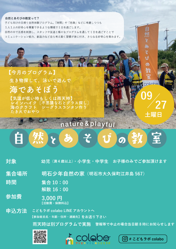 2025年9月は「明石少年自然の家」に集合・解散で海遊びを楽しむプログラムとなっています。幼児(満4歳以上)・小学生・中学生を対象にしており、お子様のみで参加可能です。参加費は3,000円となり、事前にLINEでの申し込みが必要ですのでお忘れなく!