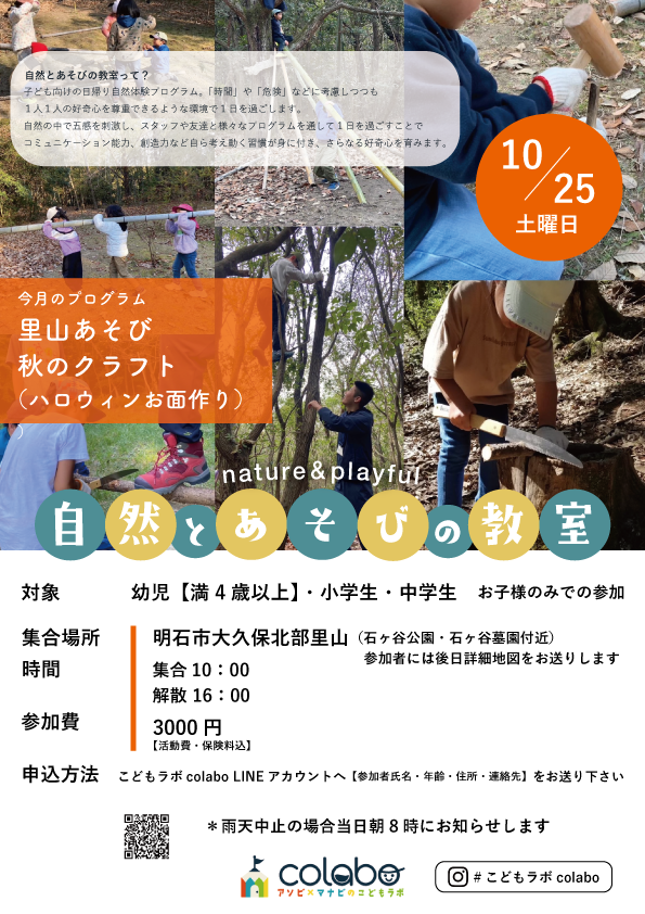 神⼾・明⽯を中⼼に⼦どもや親⼦向けに⾃然体験をはじめとする体験学習プログラムを実施している団体「こどもラボ colabo」主催の企画「自然とあそびの教室」の明石クラスが2025年10月25日(土)に開催されます!