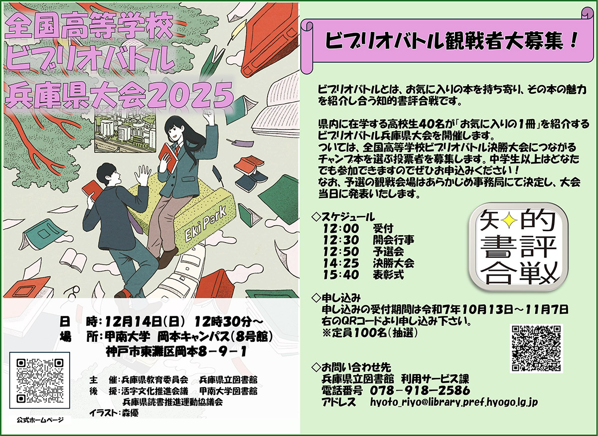 兵庫県内に在学する高校生40名が「お気に入りの1冊」を紹介するビブリオバトルイベント「全国高等学校ビブリオバトル兵庫県大会2025」の観戦者募集が始まっています!