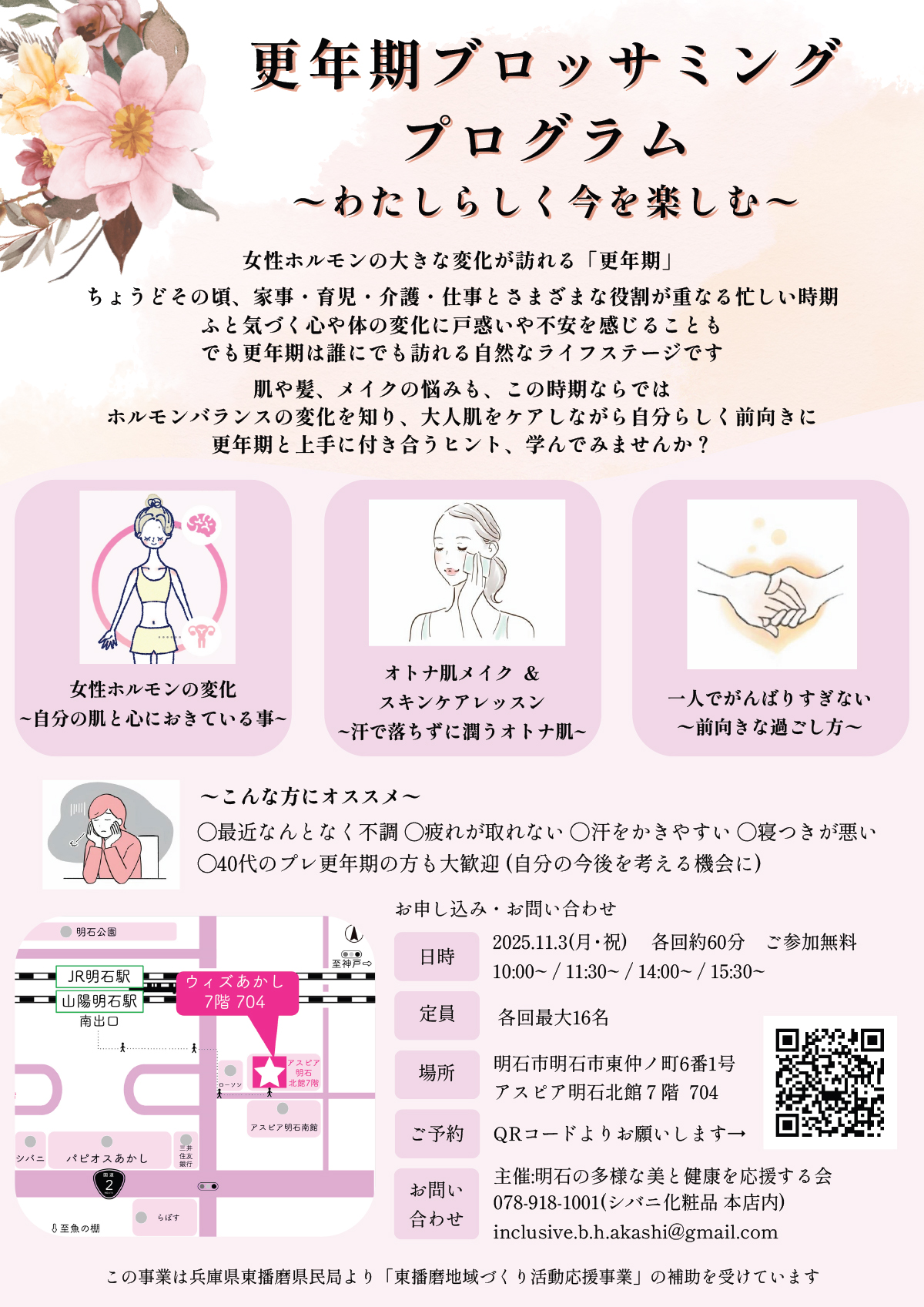 明石駅前の商業施設「アスピア明石」北館7階704で「更年期ブロッサミング プログラム 〜わたしらしく今を楽しむ〜」が2025年11月3日(月・祝)に開催されます!
