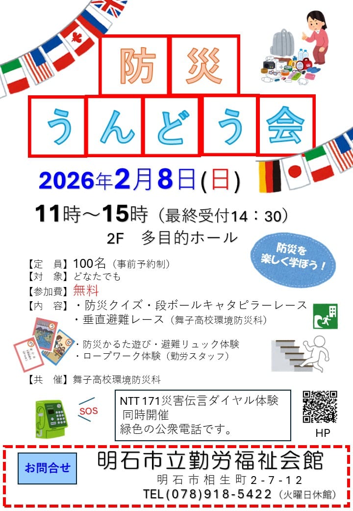 相生町の「明石市立勤労福祉会館」で、防災について学ぶイベント「防災運動会~舞子高校環境防災科の生徒さんと防災を楽しく学ぼう~」が2026年2月8日(日)に開催されます!