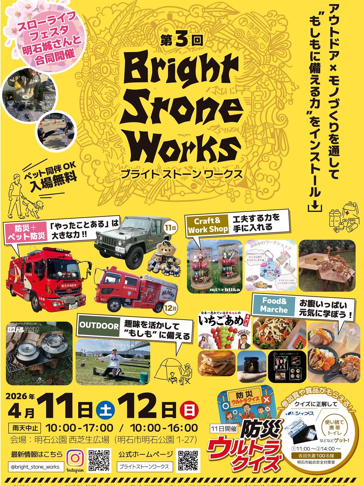 明石公園でアウトドアとものづくりの融合イベントBright Stone Works(ブライトストーンワークス)が2026年4月11日(土)・12日(日)の2日間開催されます!