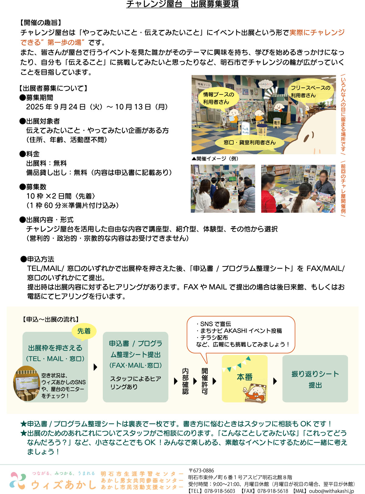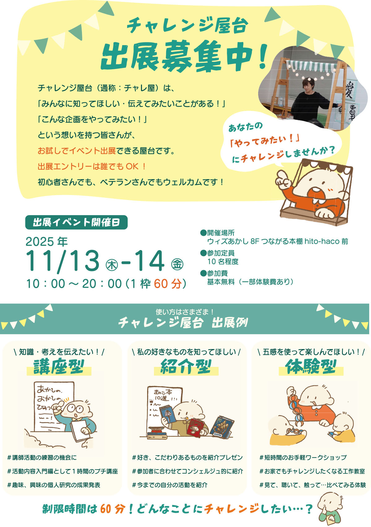 明石駅前の商業施設「アスピア明石」8階の「複合型交流拠点ウィズあかし」つながる本棚hito-haco前で「チャレンジ屋台」が2025年11月13日(木)・14日(金)の2日間開催されます!