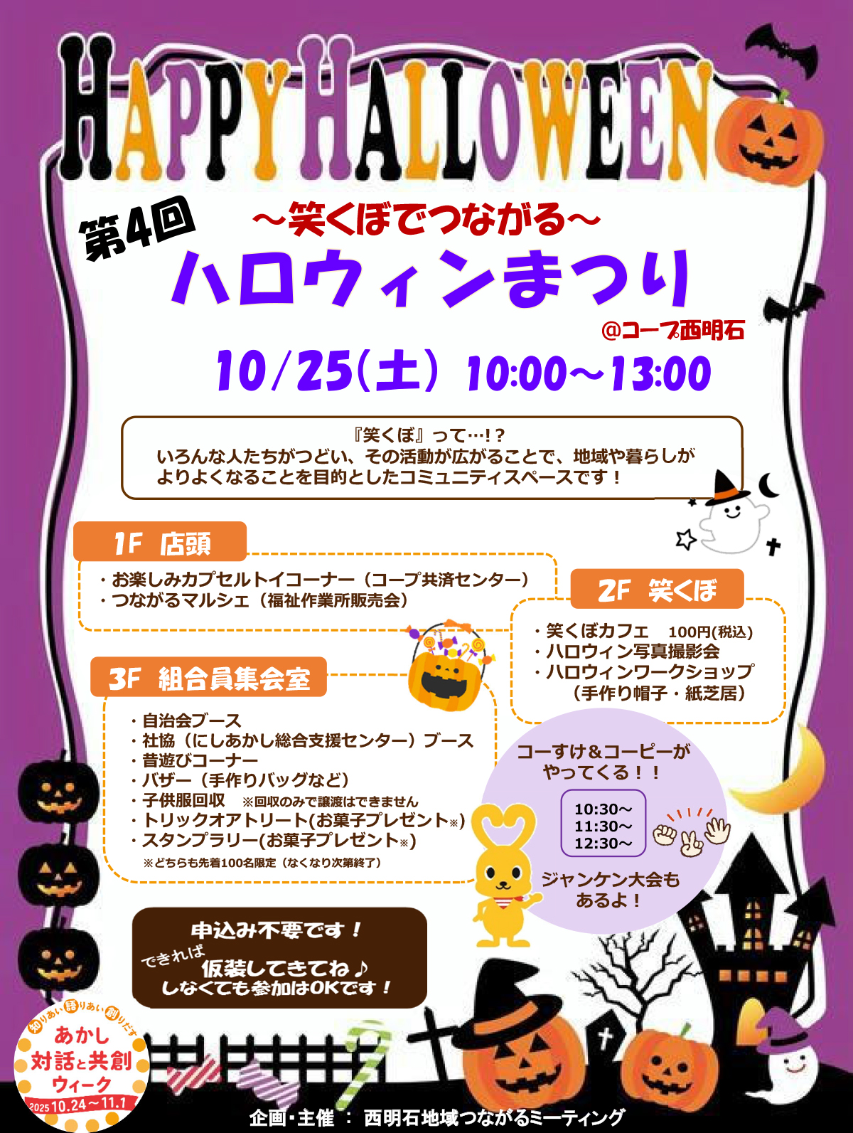 明石市西明石北町1丁目にある「コープ西明石」で「第4回 〜笑くぼでつながる〜ハロウィンまつり」が2025年10月25日(土)に開催されます!