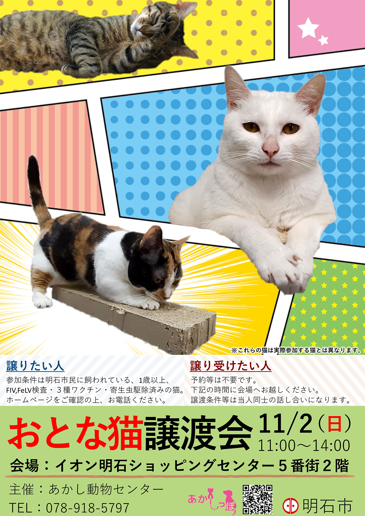 JR大久保駅前の商業施設「イオン明石ショッピングセンター」5番街2階特設会場で「あかし動物センター」主催の「おとな猫譲渡会」が2025年11月2日(日)に開催されます!