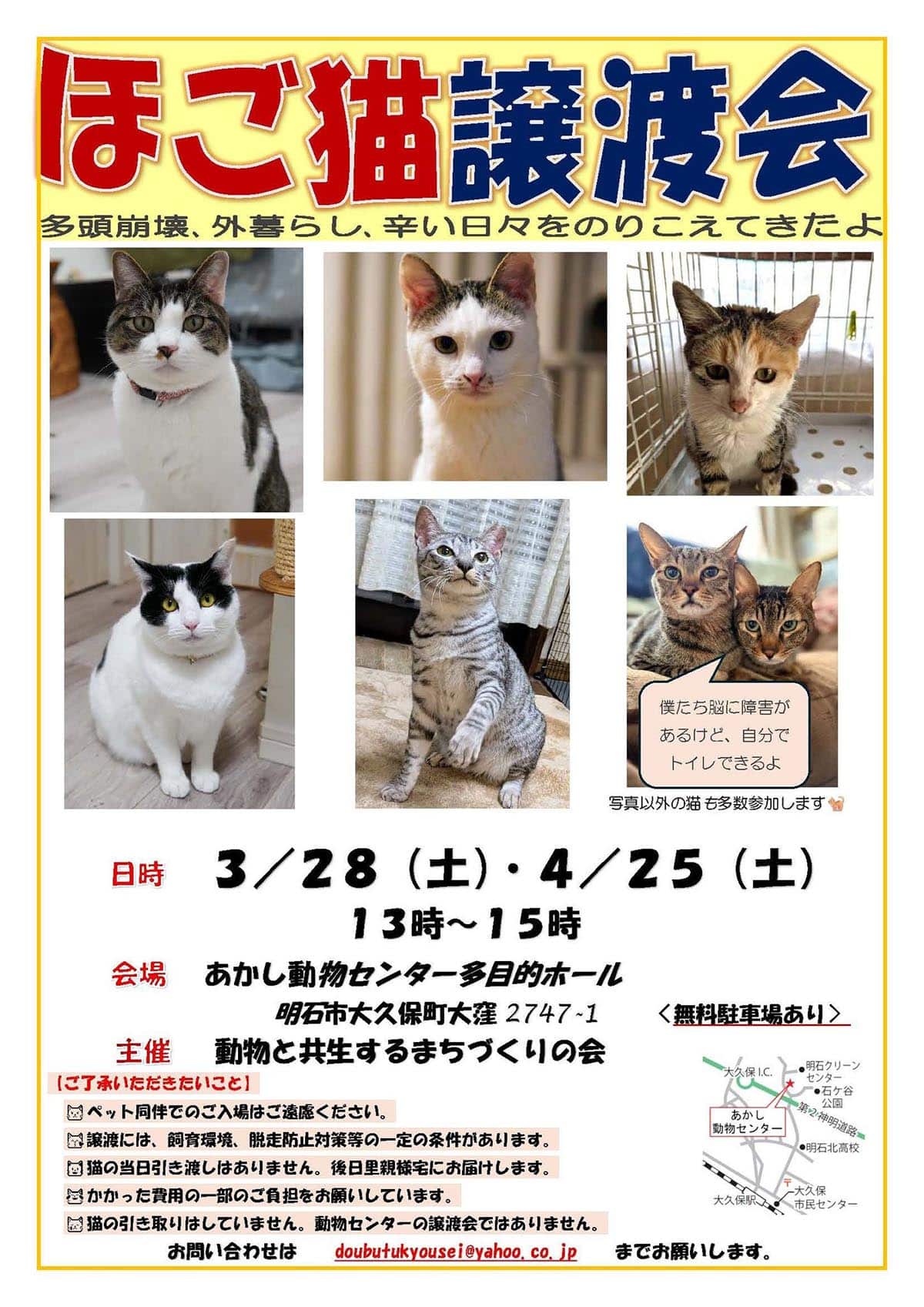 大久保町大窪の「あかし動物センター」多目的ホールで「動物と共生するまちづくりの会」による「ほご猫譲渡会」が2026年3月28日(土)・4月25日(土)に開催されます!