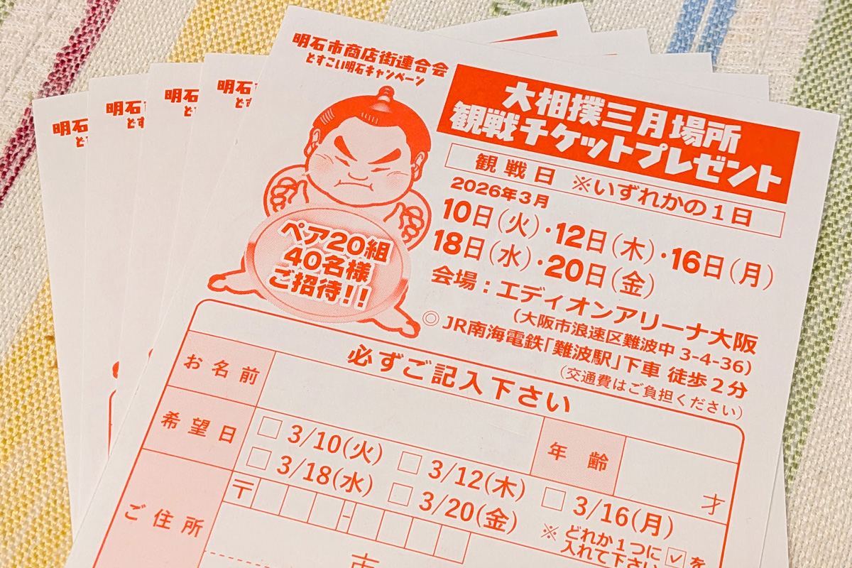 明石市内の商店街加盟店舗で配布されている応募ハガキで応募可能で、大相撲春場所の観戦チケットがペア20組40名に当選します。応募締め切りは2026年1月26日(月)必着ですが、応募ハガキがなくなり次第終了となりますのでお早めに!