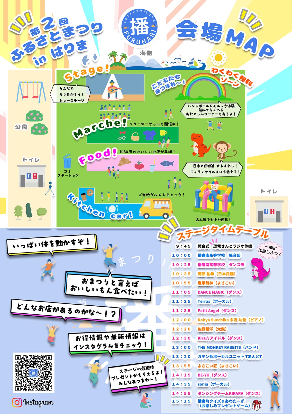 ご当地グルメなど約30店舗のおいしい食べ物が集合するほか、歌やダンスなどのステージ、ふわふわ遊具やハンドボール、モルックなどが無料で遊べるコーナーもあるそうです!