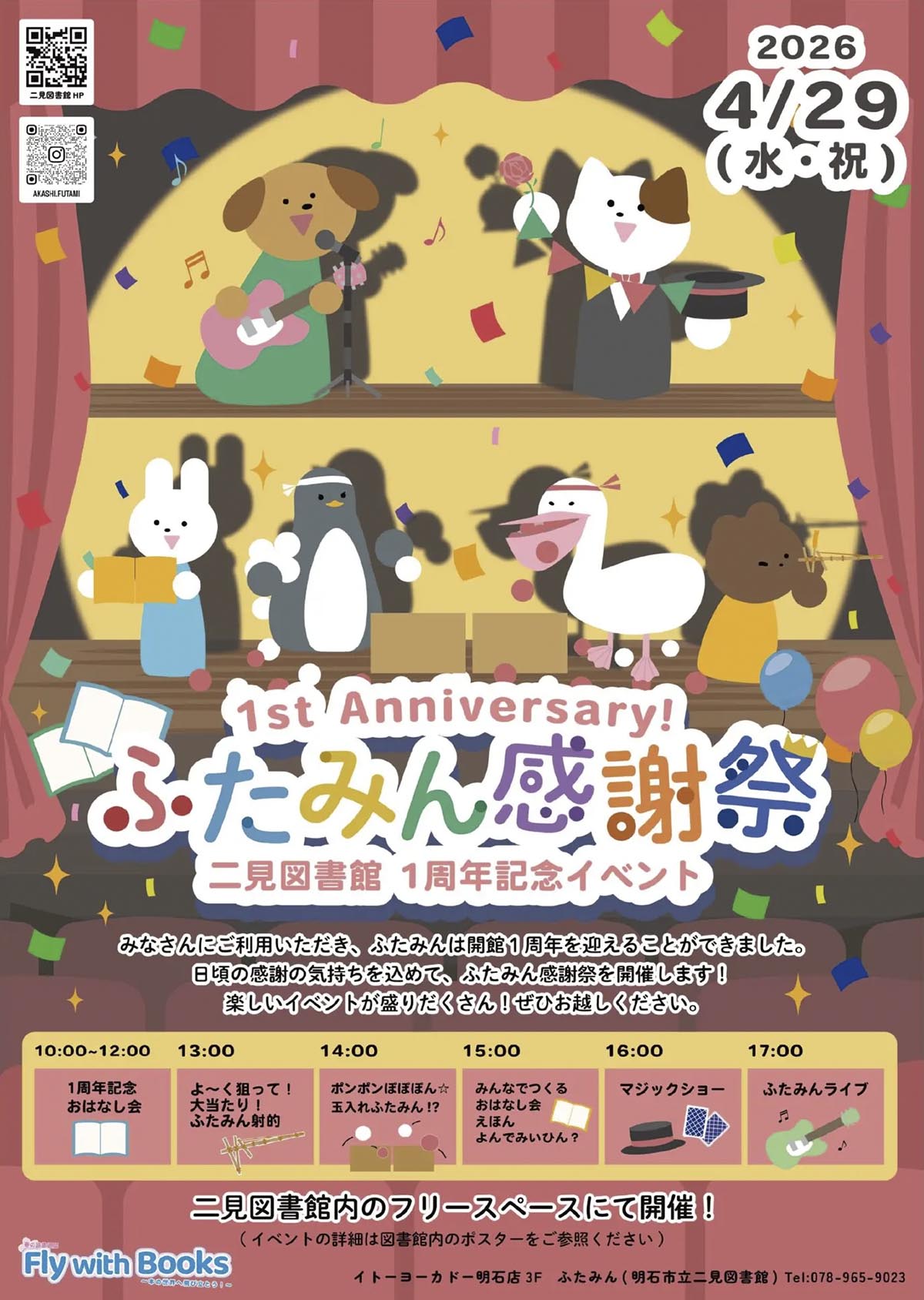1周年の記念イベント「1stAnniversary!ふたみん感謝祭」ではまず、絵本などの読み聞かせがある。ふたみんで読み聞かせ活動に取り組む「よみきかせ はとの会」「明石おやこ劇場」「ふれあいプラザあかし西」の3グループが登場する。