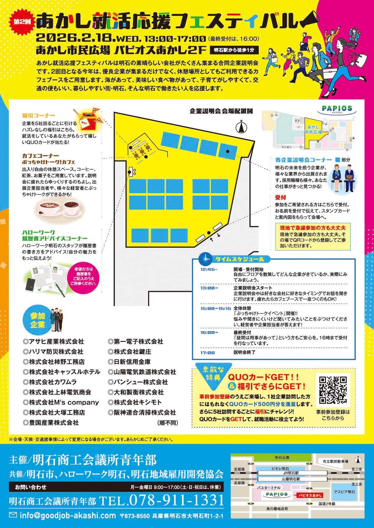 明石駅前の商業施設「パピオスあかし」2階の「あかし市民広場」で、2026年卒業~2028年卒業予定の大学生、専門学校生の方から、35歳未満の求職・転職中の方を対象とした合同企業説明会「第2回 あかし就活応援フェスティバル」が2026年2月18日(水)に開催されます!