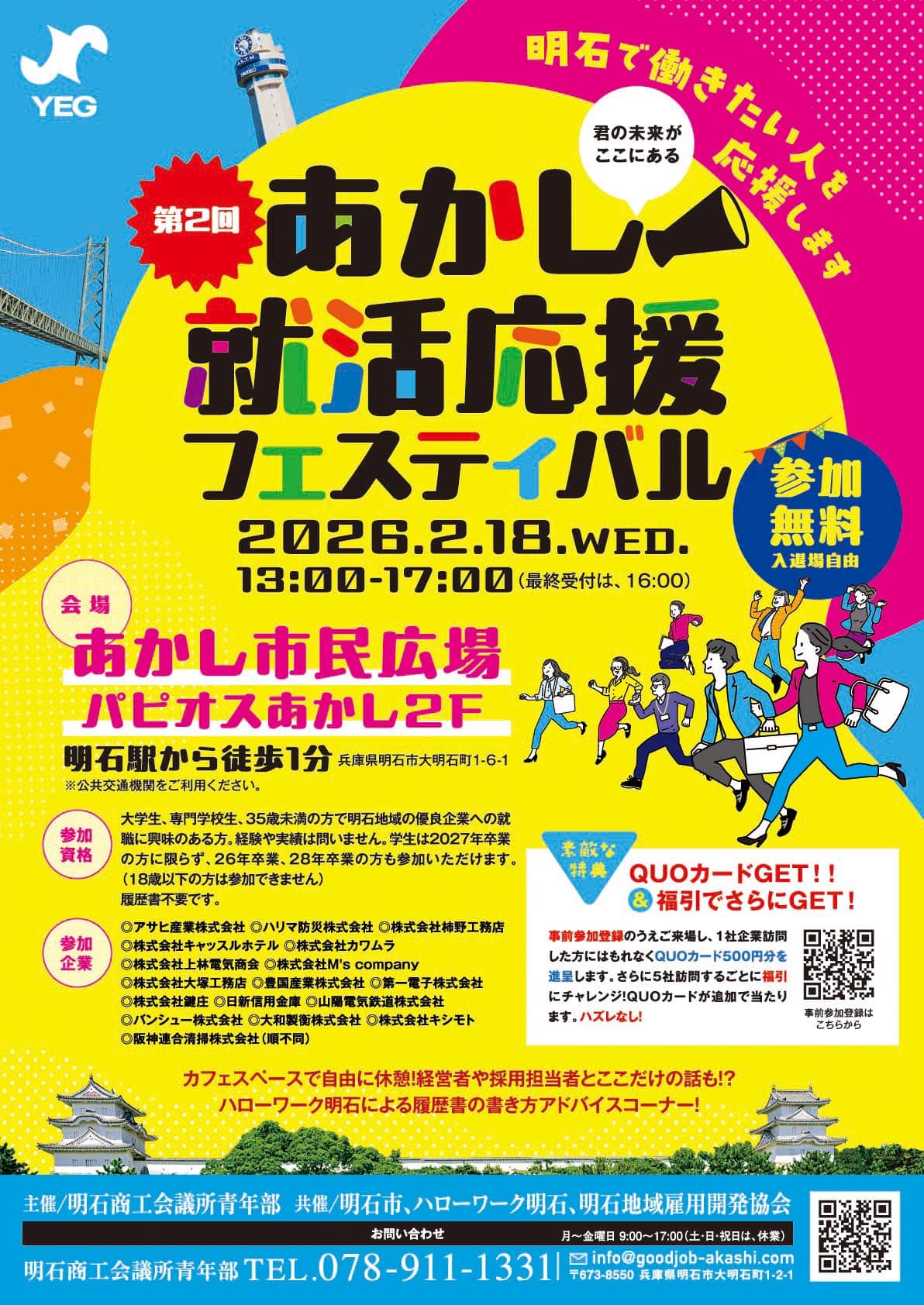 明石駅前の商業施設「パピオスあかし」2階の「あかし市民広場」で、2026年卒業~2028年卒業予定の大学生、専門学校生の方から、35歳未満の求職・転職中の方を対象とした合同企業説明会「第2回 あかし就活応援フェスティバル」が2026年2月18日(水)に開催されます!