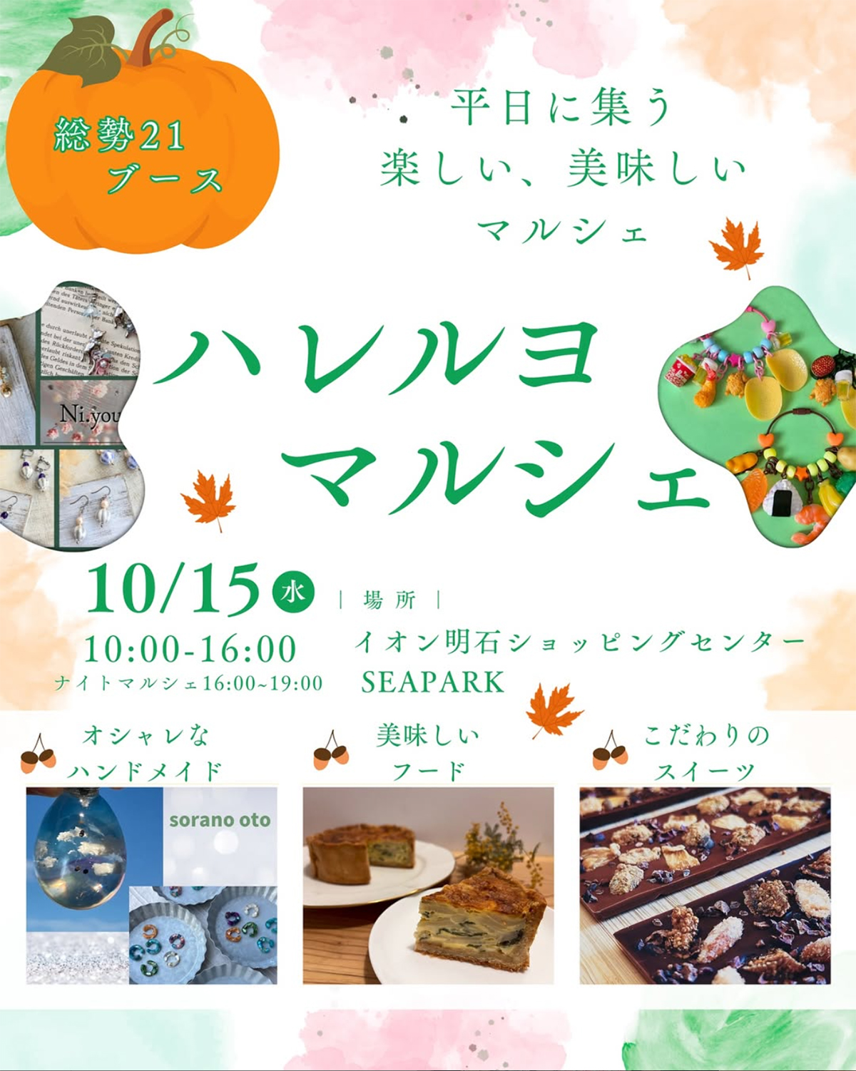 JR大久保駅南側にある商業施設「イオン明石ショッピングセンター」2番街1階のSEAPARKで「ハレルヨマルシェ」が2025年10月15日(水)に開催されます!