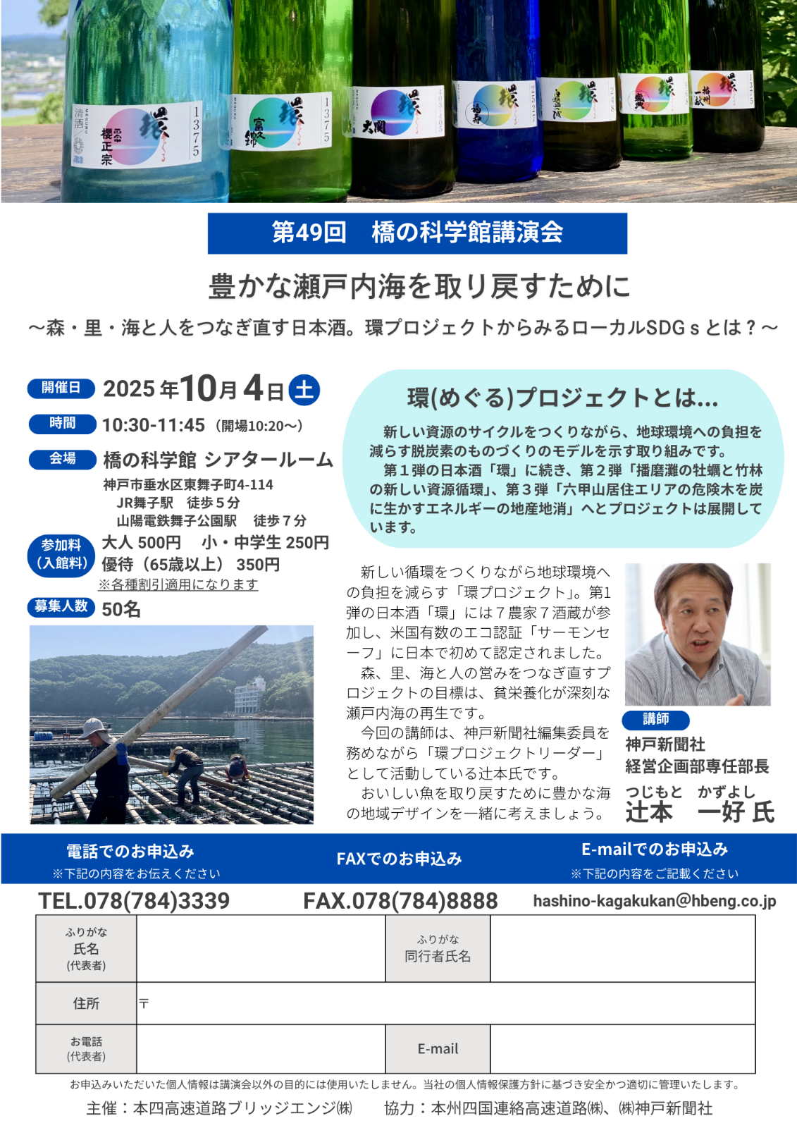 明石大橋にも使われた世界最高水準の海洋架橋技術の数々を余すところなく体験することが出来るサイエンスミュージアム「橋の科学館」で行われる講演会で、第49回となる今回は「豊かな瀬戸内海を取り戻すために ~森・里・海と人をつなぎ直す日本酒。環プロジェクトからみるローカルSDGsとは?~」をテーマに、神戸新聞社編集委員であり「環プロジェクトリーダー」として活動されている辻本一好氏が登壇されます