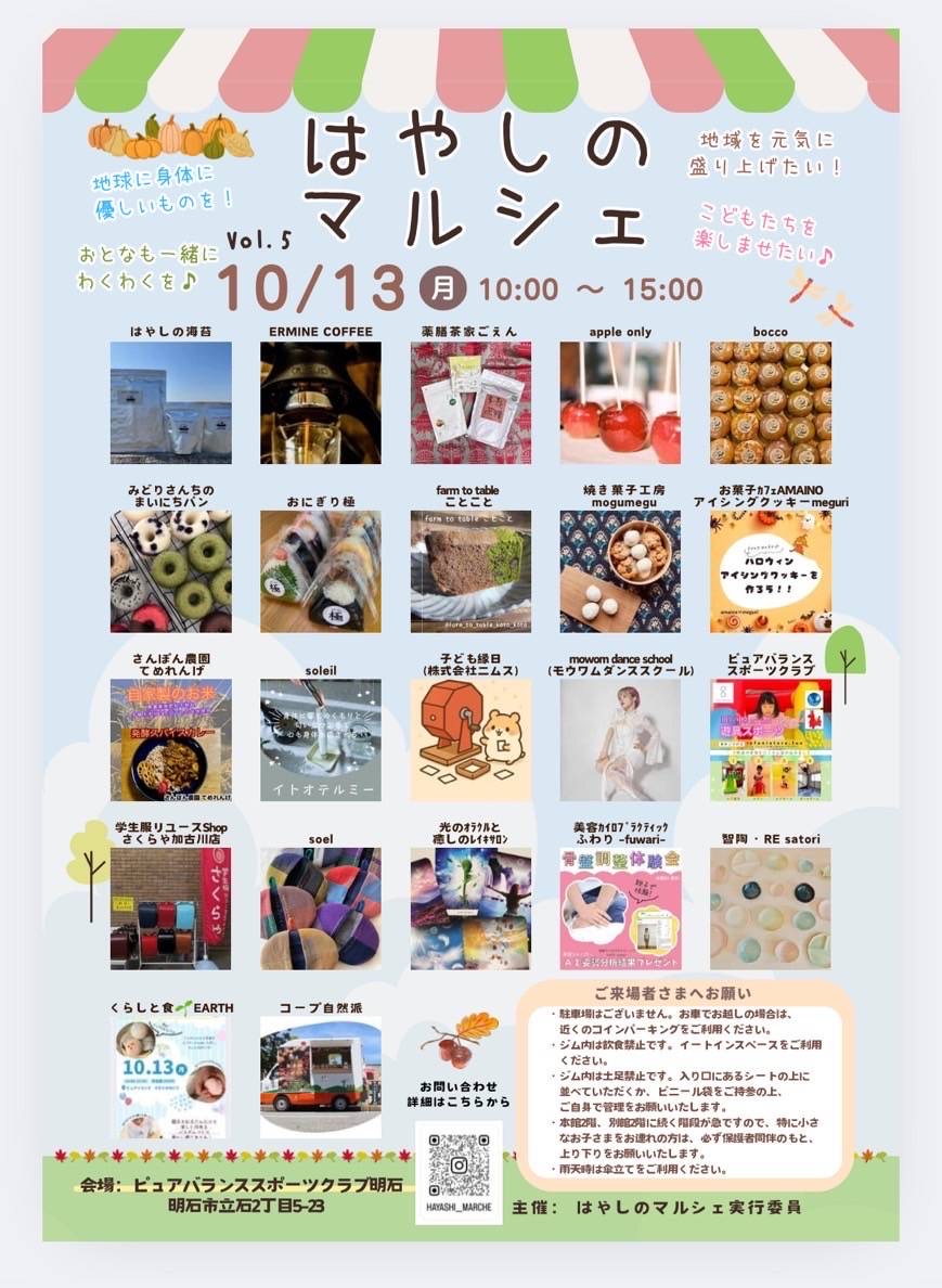 立石にあるフィットネスジム&スタジオ「ピュアバランススポーツクラブ明石」のスタジオ内と店前で「はやしのマルシェ」が2025年10月13日(月・祝)に開催されます!