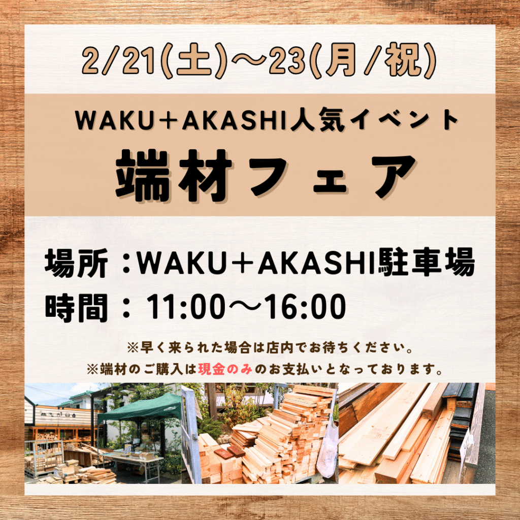 江井島の「日置建設株式会社」敷地内にあるインテリア雑貨などの販売店WAKU+AKASHI (ワクタスアカシ)駐車場で、お得な端材フェアが2026年2月21日(土)~23日(月・祝)の3日間開催されます!