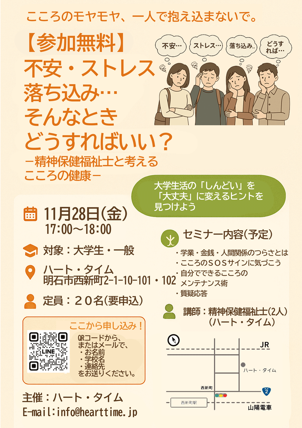 山陽電鉄「西新町駅」近くにある「ハート・タイム」で無料セミナー不安・ストレス・落ち込み…そんな時どうすればいい? ― 精神保健福祉士と考える「こころの健康」―が2025年11月28日(金)に開催されます!