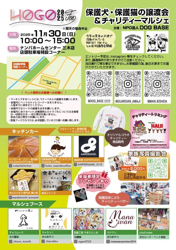 三木市末広にある「ナンバホームセンター三木店」の店頭駐車場特設コーナーで保護犬・保護猫の譲渡会&チャリティーマルシェ「HOGO fes 2025」が2025年11月30日(日)に開催されます!