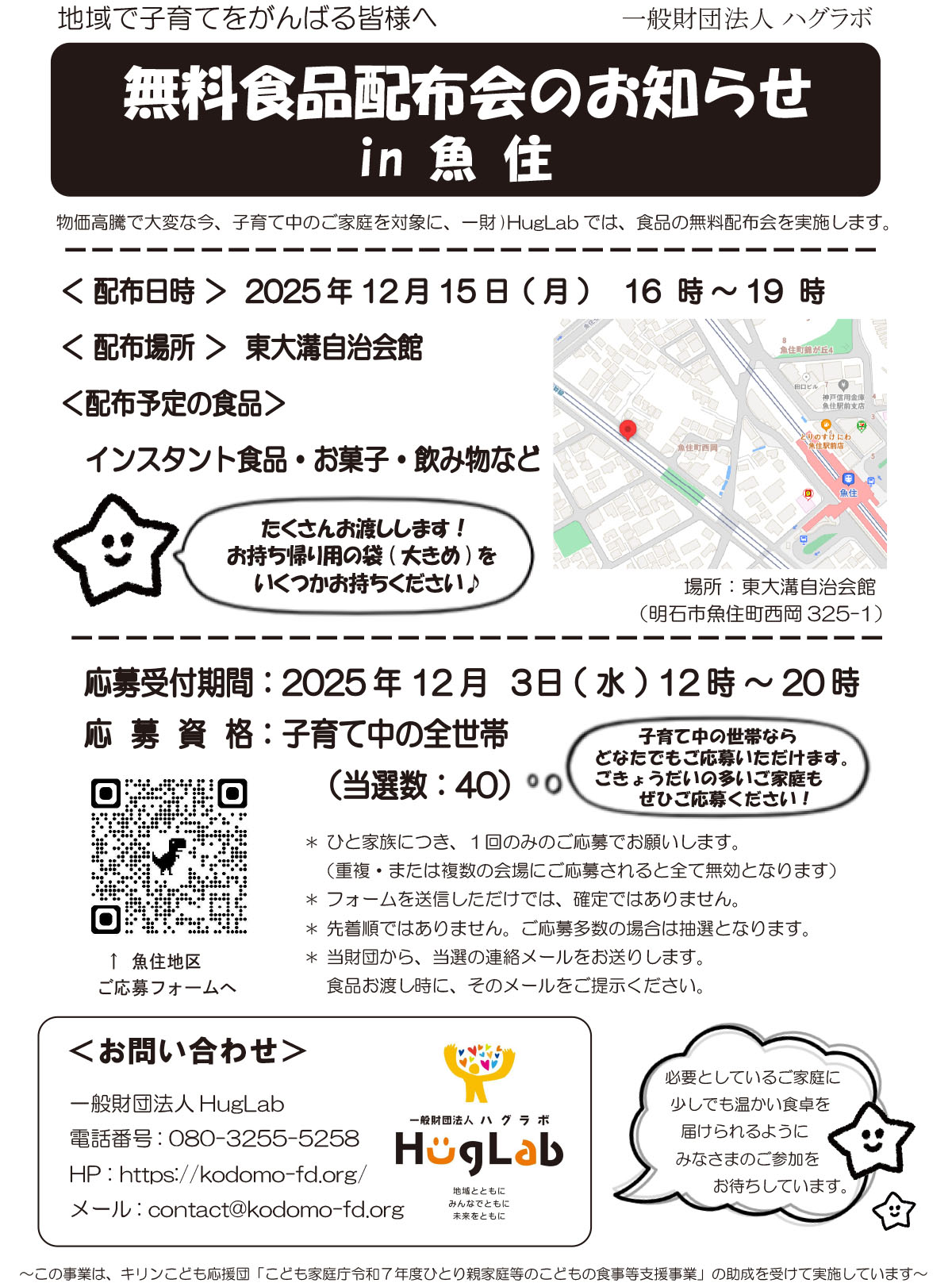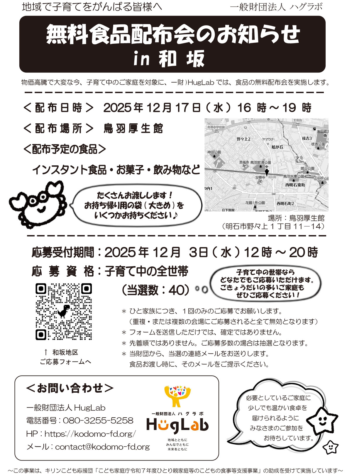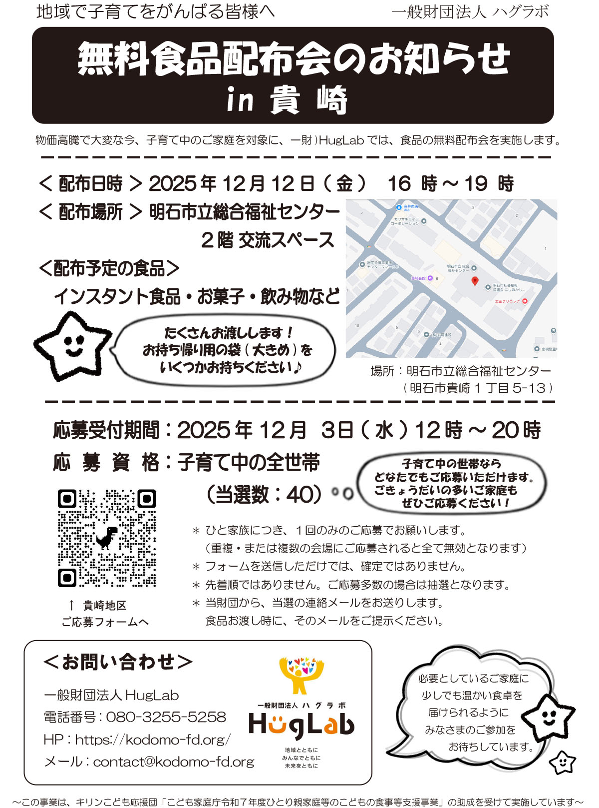 キリンこども応援団の「こども家庭庁令和7年度ひとり親家庭等のこどもの食事等支援事業」の助成を受けて実施される活動で、インスタント食品・お菓子・飲み物などの食材が配布される予定となっております。応募受付は2025年12月3日(水)12:00~20:00となっており、配布実施日はエリアによって異なりますので、それぞれのチラシデータをご確認ください!