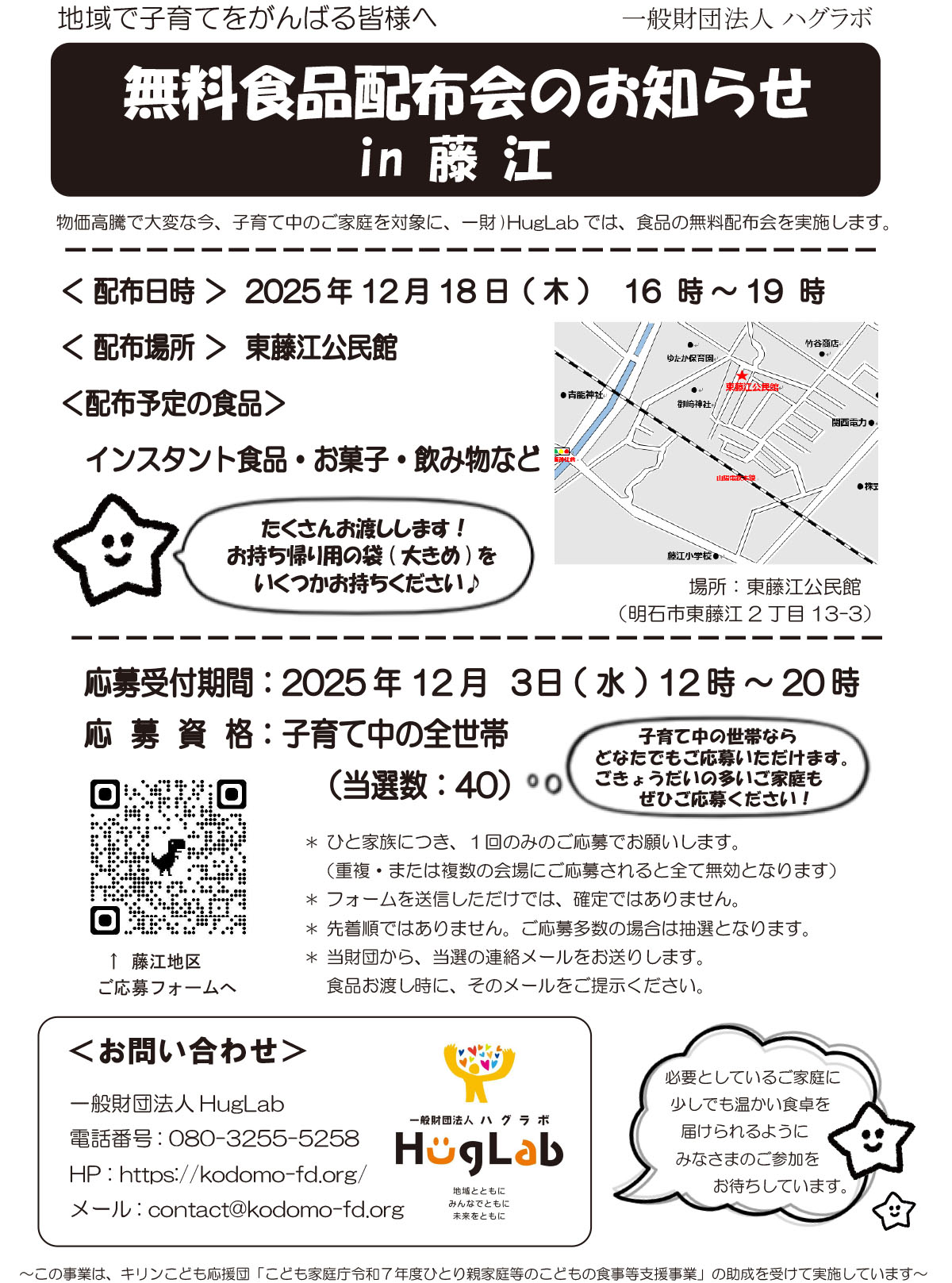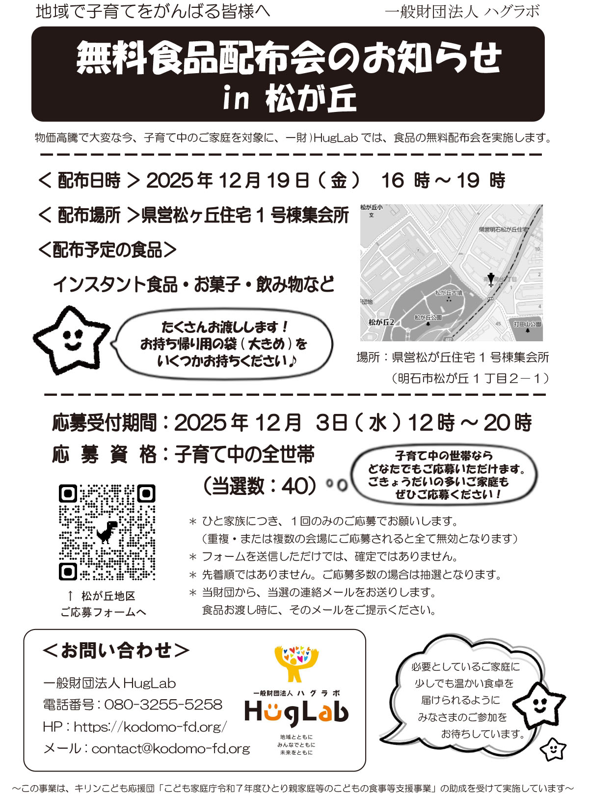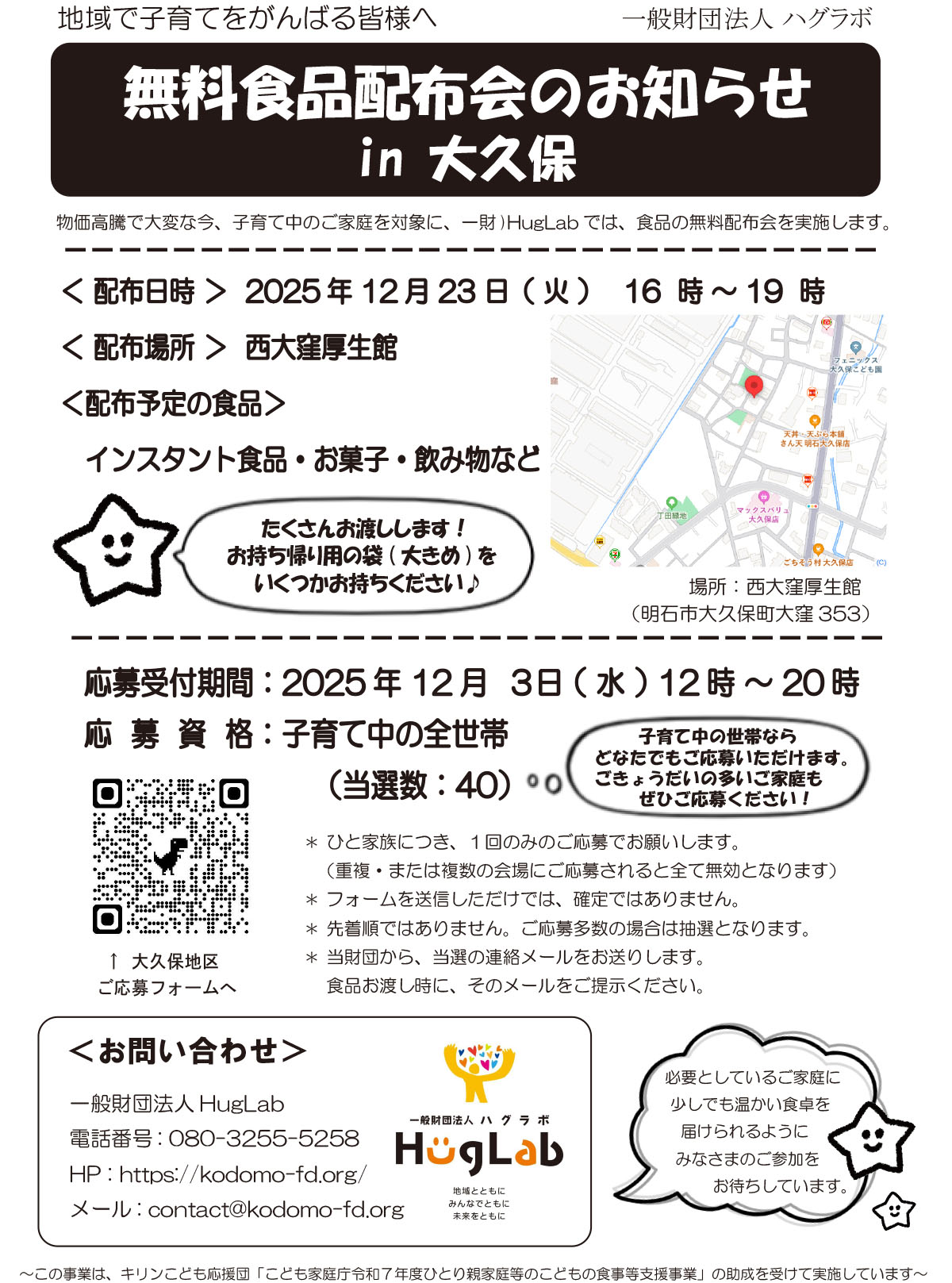 キリンこども応援団の「こども家庭庁令和7年度ひとり親家庭等のこどもの食事等支援事業」の助成を受けて実施される活動で、インスタント食品・お菓子・飲み物などの食材が配布される予定となっております。応募受付は2025年12月3日(水)12:00~20:00となっており、配布実施日はエリアによって異なりますので、それぞれのチラシデータをご確認ください!