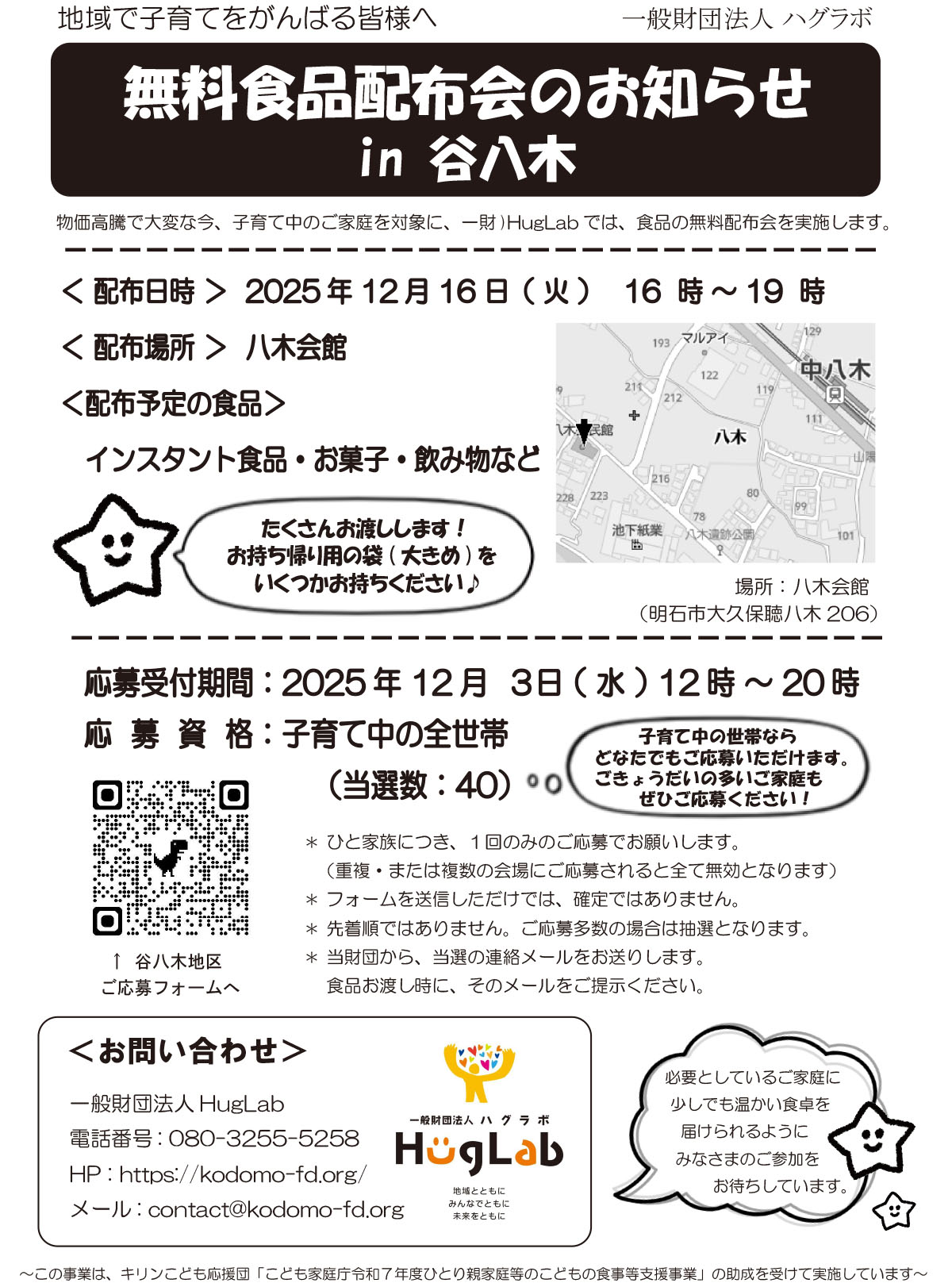 明石市内7エリア(藤江・貴崎・谷八木・和坂・松が丘・大久保・魚住)で、子育て世帯を対象にした「無料食品配布会」が2025年12月に開催されます!