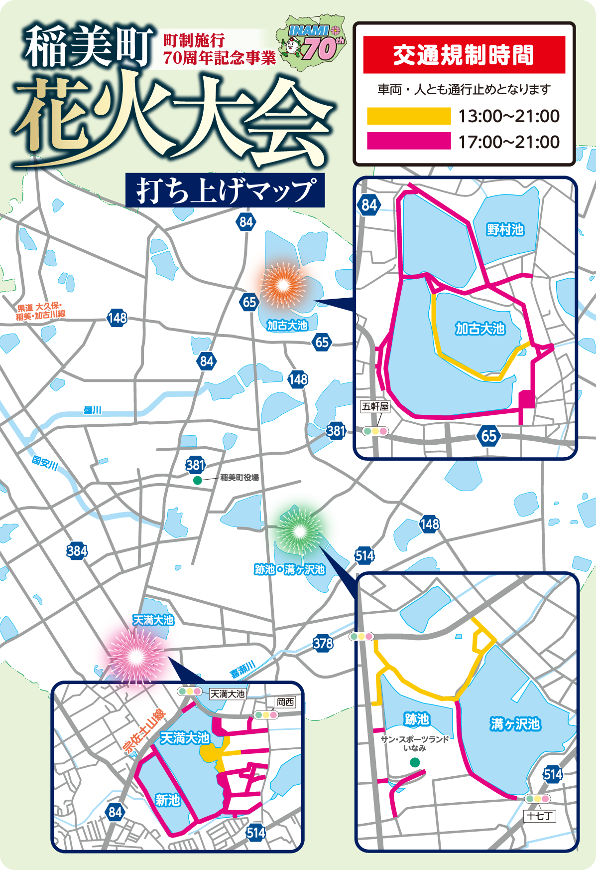 稲美町の町制施行70周年記念事業は一覧で紹介されており、花火大会の同日日中には国安「コスモホール」で「町制施行70周年記念式典」が開催される予定となっています