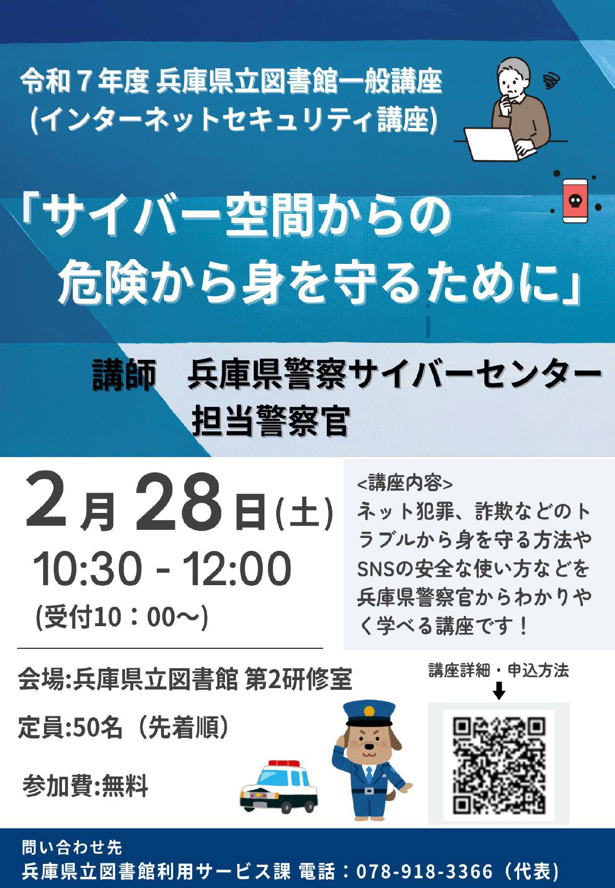 インターネット犯罪、詐欺などのトラブルから身を守る方法やSNSの安全な使い方などを兵庫県警察官からわかりやすく学べる講座となっています。定員は先着順で50名となっているので、興味がある方はお早めに!