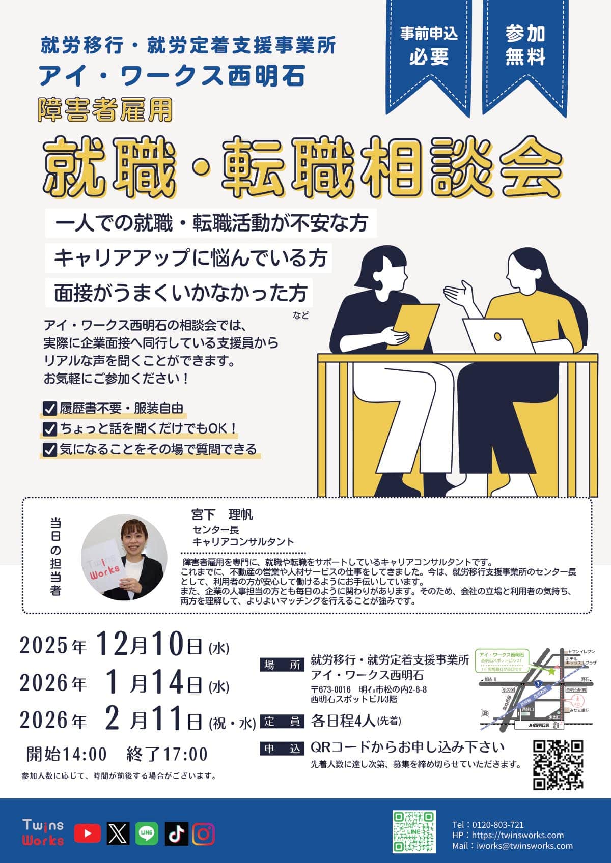JR西明石駅から徒歩圏内にある就労定着支援事業所「アイ・ワークス西明石」で、障害者雇用での就職や転職を考えている方を対象とした「障害者雇用 無料就職・転職相談会」が2026年2月11日(水・祝)に開催されます!